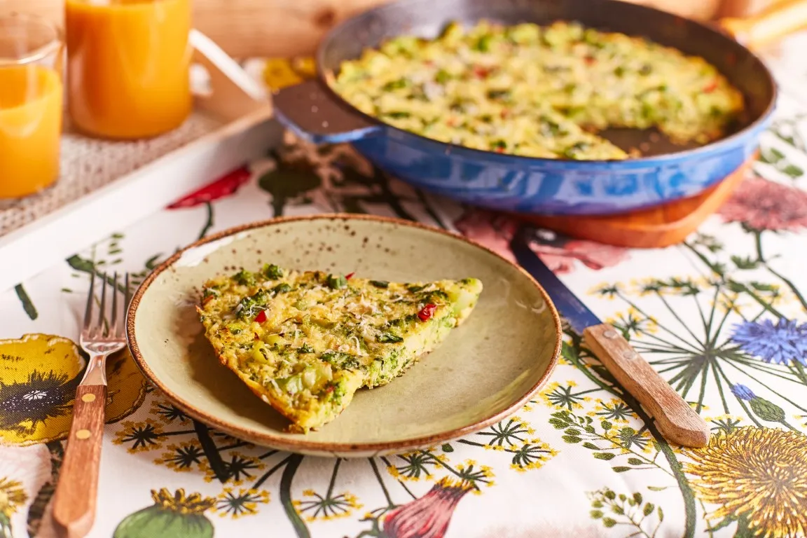 Egy sütőben is használható serpenyőben, az olívaolajon elkezdjük pirítani a felszeletelt chilit. A felét kiszedjuk, a maradékra pedig rádobjuk az apróra vágott hagymát, fokhagymát. Ha üvegesre párolódott, rádobjuk a brokkolit. Sózzuk, borsozzuk, szerecsendiót reszelünk rá és ha az egész egy picit lepirult, ráöntjük a tojásos keveréket. 2-3 percig lassú tűzön kevergetés nélkül sütjük, majd 200 fokra előmelegített sütőben addig sütjük, míg a teteje össze nem áll. Ha már megszilárdult, kivesszük, megszórjuk a félretett chilivel, apróra vágott bazsalikommal és reszelt parmezánnal. Szeletekre vágva tálaljuk.