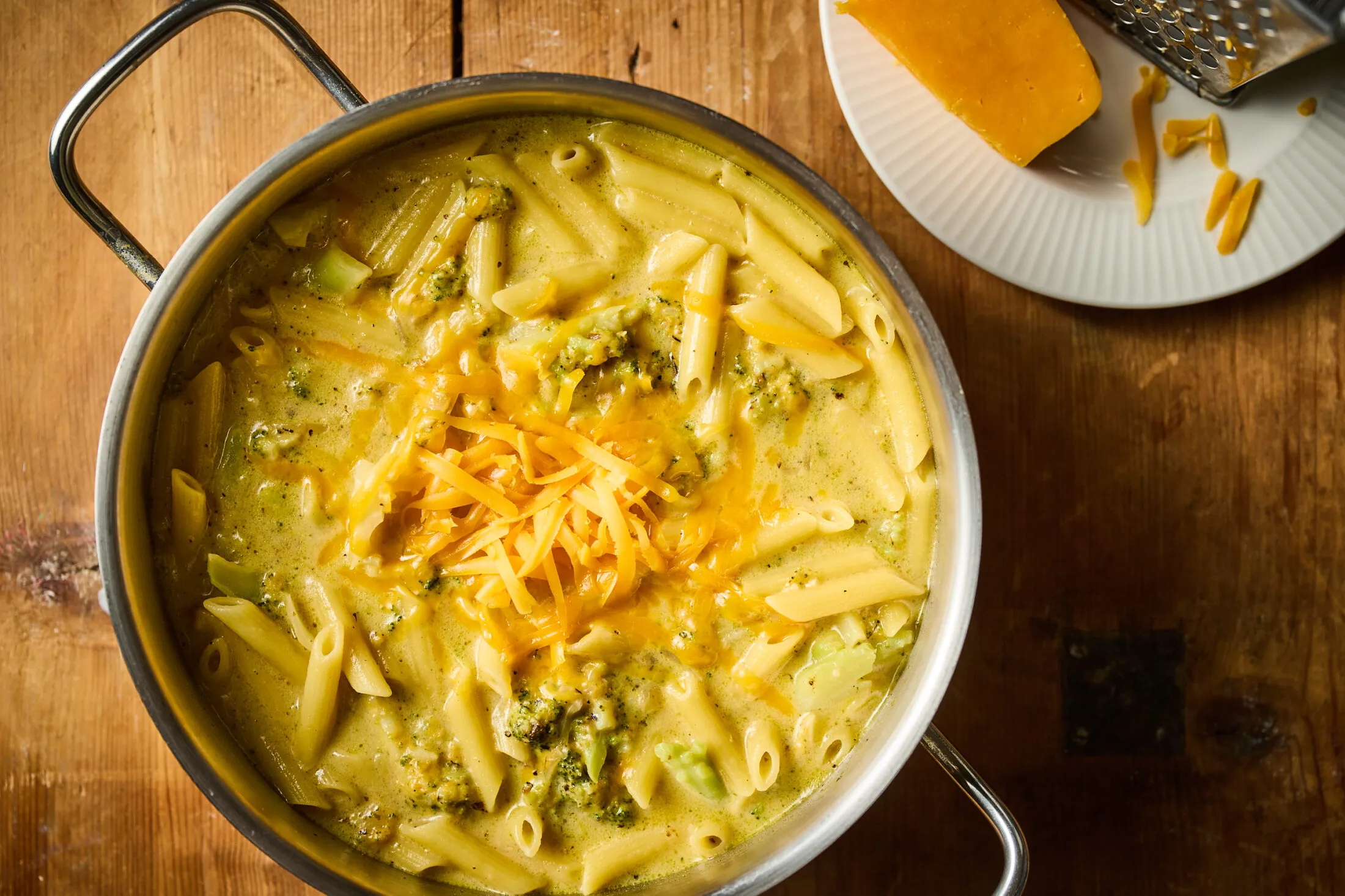 A brokkolis sajtkrémes tészta első lépéseként egy lábasban, közepesen magas hőmérsékleten olajat hevítünk és lepirítjuk benne a cikkekre vágott vöröshagymát. Hozzáadjuk a zúzott fokhagymát és az apró rózsáira szedett brokkolit is. 5-6 percig pirítjuk, majd felöntjük a tejjel és az alaplével. Felforraljuk, aztán beledobjuk a pennét. Közepes lángon 10-12 percig főzzük, amíg megpuhul a tészta és felszívja a folyadék nagy részét. Ekkor beleszórjuk a reszelt cheddar sajtot, fűszerezzük sóval, borssal és egy kevés chiliporral, majd 5 perc alatt összefőzzük, míg a sajt teljesen felolvad benne. Tálalásnál reszelünk rá még egy kis cheddart, és készen is vagyunk.