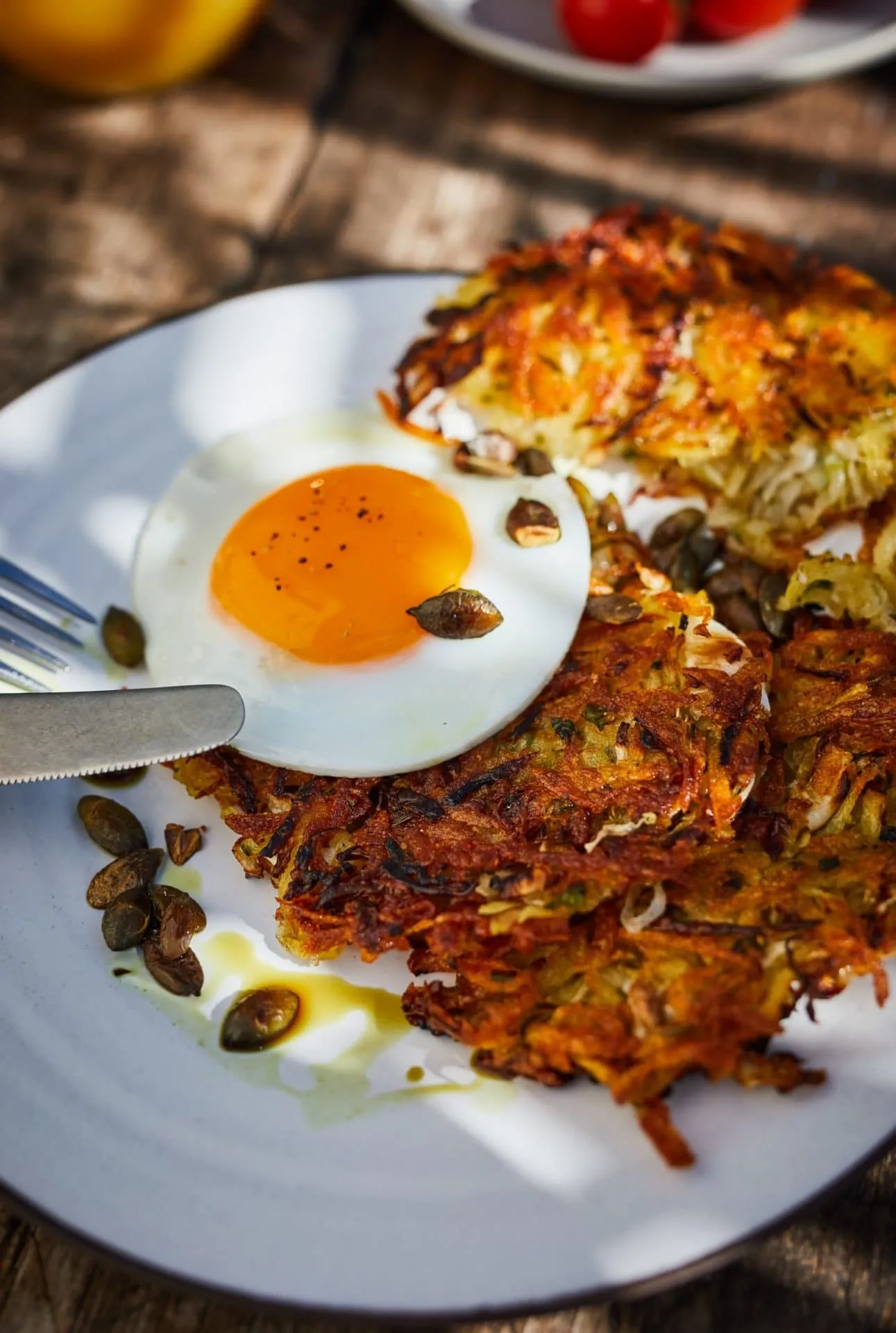 A tökmagot száraz serpenyőbe közepes hőfokon, folyamatos keverés mellett ropogósra pirítjuk, majd félretesszük. A rösztimix mindkét oldalát egy tapadásmentes serpenyőben, 1-2 mm-nyi olajon, közepes hőmérsékleten megsütjük, amíg szép ropogós barna nem lesz. Ha szükséges, közben pótoljuk az olajat, majd kiszedjük és egy papírtörlőn leitatjuk a rösztit. A tojásokat egy tapadásmentes serpenyőben, közepes-alacsony lángon megsütjük az olajon. A rösztire teszünk a pirult tökmagból és a tojásból, és meglocsoljuk tökmagolajjal.