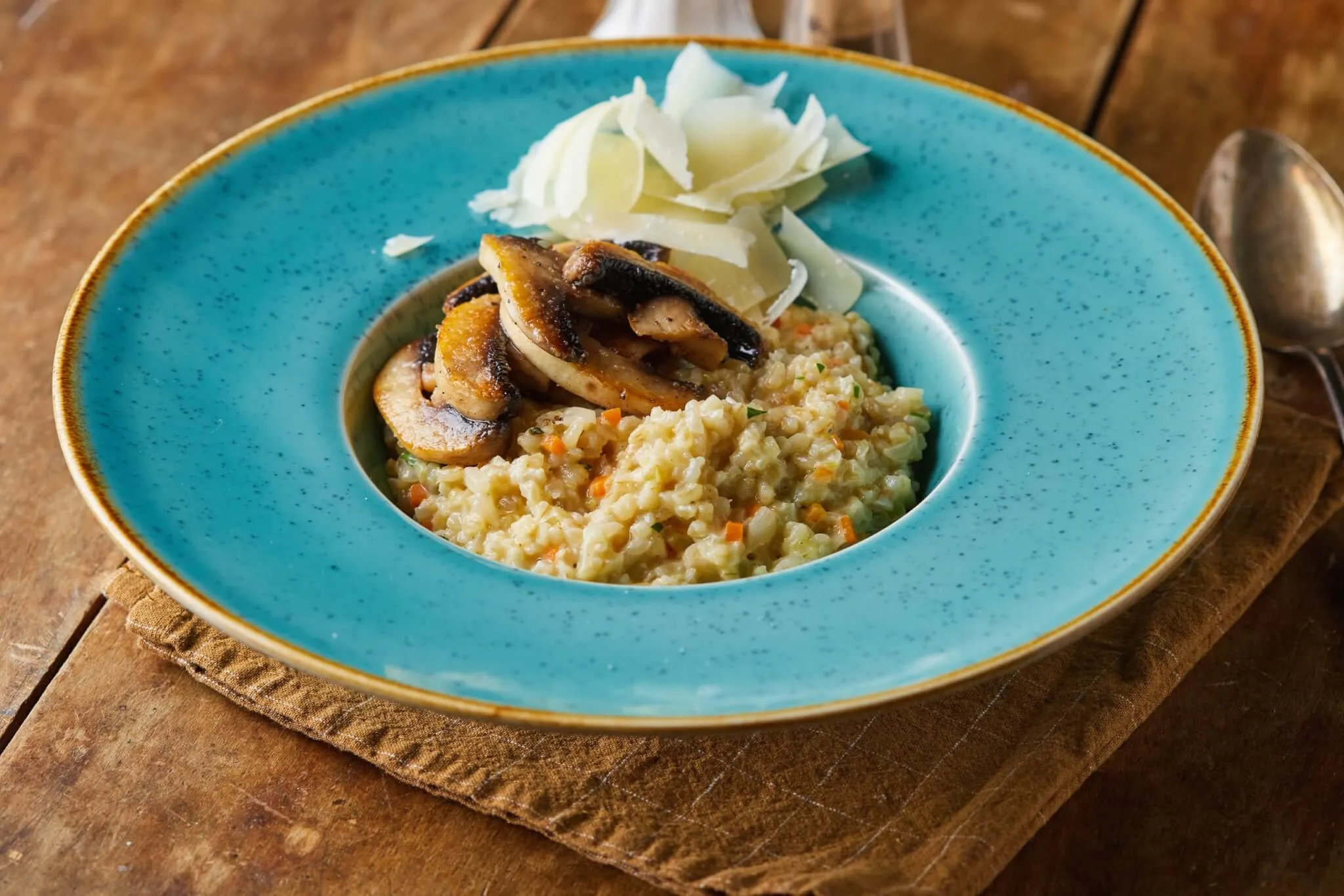 Közben egy serpenyőt füstölésig hevítünk, majd néhány csepp olajon megpirítjuk benne a felszeletelt gombát, amit a végén enyhén sózunk és borsozunk, majd a rizottó tetejére tesszük a maradék parmezánból készült forgácsokkal együtt.