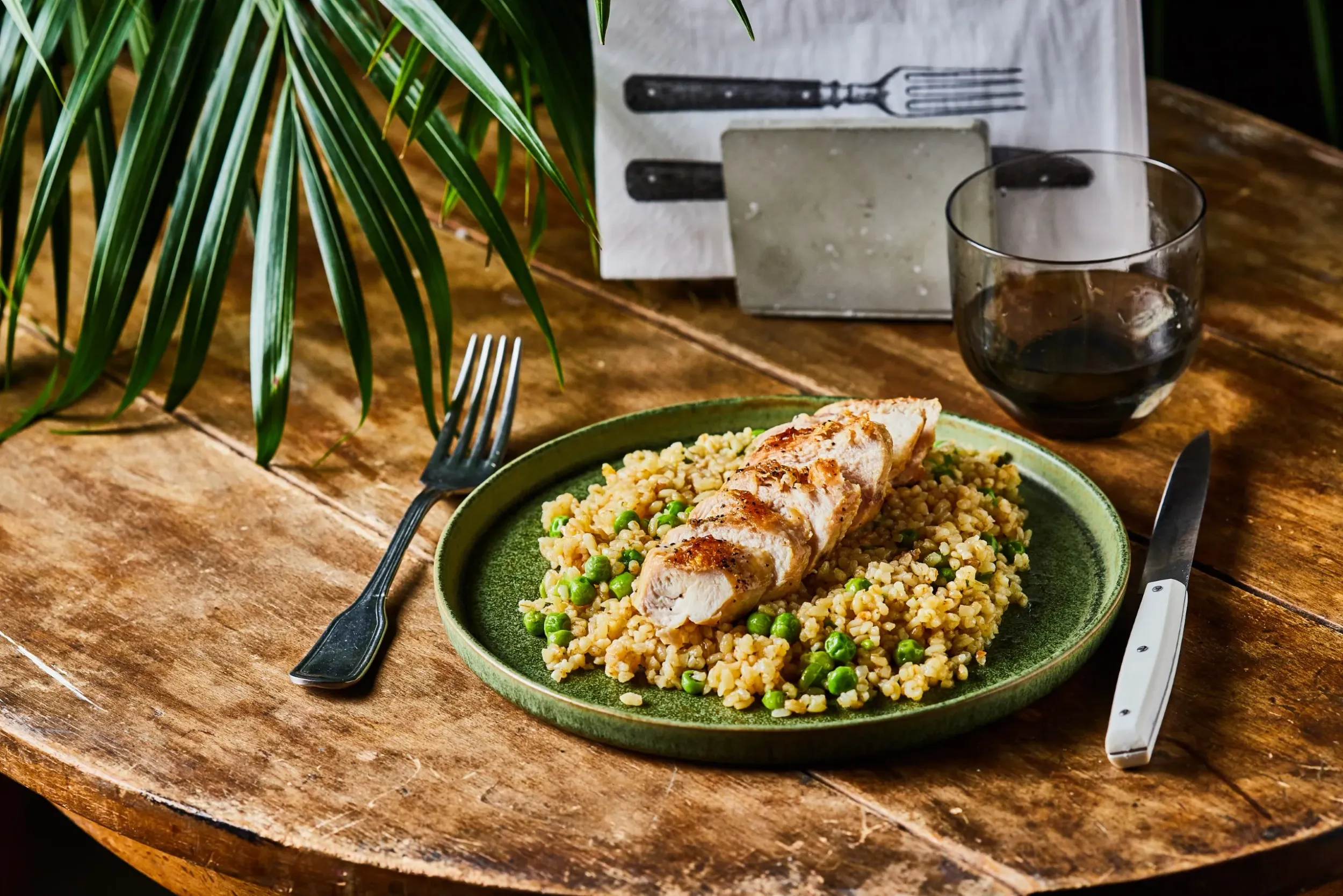 Tányérra szedjük a bulgurrizottót, rátesszük a felszeletelt csirkemellet, és tálaljuk.