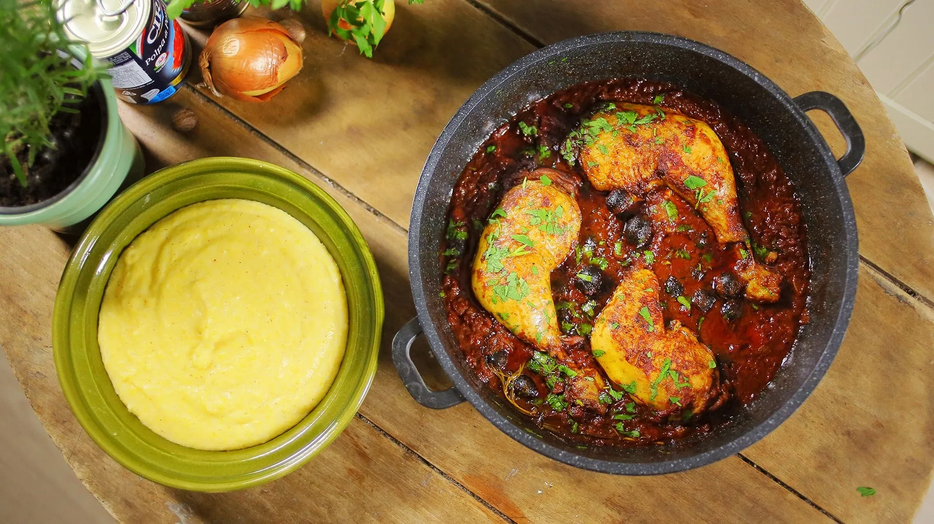 Az egészet felöntjük a vörösborral és 2-3 percig intenzíven forraljuk, hogy az alkohol elpárologjon. Ezután rádobjuk az egész ág rozmaringot és felöntjük a paradicsomkonzervvel. A ragut felönjük 2 dl vízzel és sóval, borssal, reszelt szerecsendióval ízesítjük. Fedő alatt, kis lángon 30 percen át pároljuk a combokat. Ekkor hozzáadjuk a fekete olajbogyót és szükség szerint még kevés vizet adunk hozzá. Egy szaftos, illatos, rusztikus mártást kell kapnunk. Fedő alatt további 20 percig rotyogtatjuk kis lángon.
