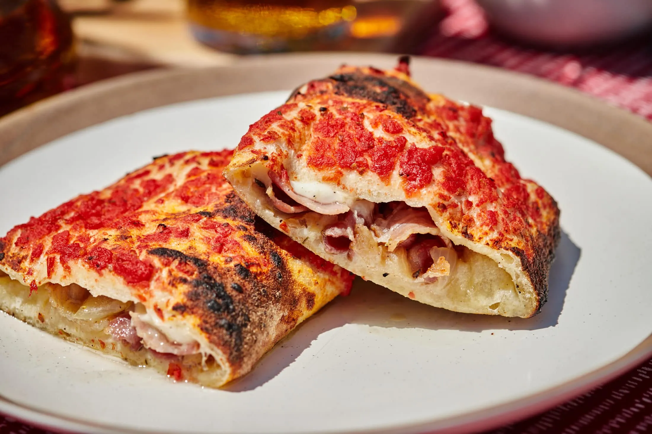 A megkelt pizzatésztát kukoricalisztes deszkán kör alakúra formázzuk, és belehalmozzuk a szalonnás ragut. Rátépkedünk a mozzarella sajtból, reszelünk rá egy kevés parmezánt is, ráhajtjuk a tésztát, és a széleit egy kicsit összenyomkodjuk. A paradicsomszószt befűszerezzük sóval és oregánóval, majd a tészta tetejét megkenjük vele. Forró pizzasütőben többször megforgatva készre sütjük.
