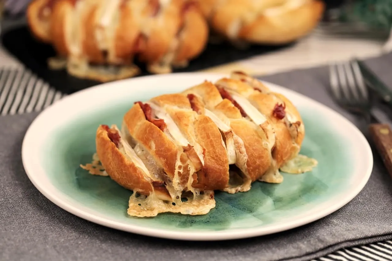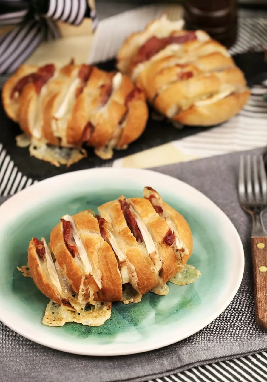 A zsemléket éles késsel kb. 1 centiméterenként bevagdossuk, úgy, hogy mélyek legyenek a vágatok, de ne vágjuk át a zsemlét. A kis “zsebekbe” prosciutto szeleteket tömködünk. A sajtot vékony szeletekre vágjuk és ezeket is a sonkaszeletek mellé rakjuk. Lekenjük olvasztott vajjal és 190 fokos sütőben kb. 15 perc alatt megpirítjuk őket.