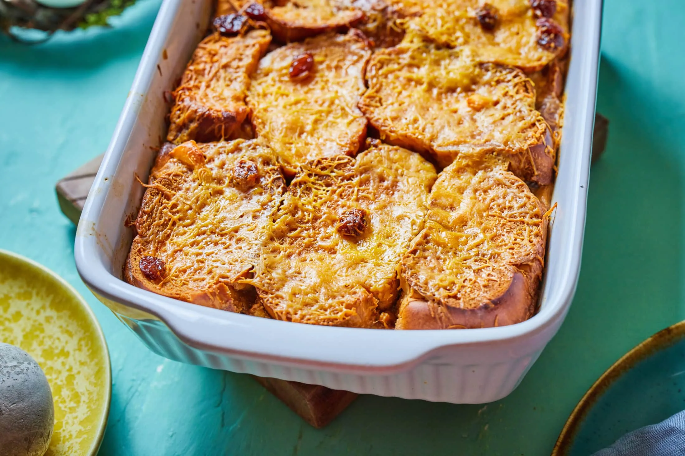 Egy 30 x 18 cm-es tespi aljára rakunk egy sor kalácsot. Megszórjuk mazsolával és reszelt sajttal, majd ráöntjük a tejes keverék egyharmadát. Újabb réteg kalács, mazsola és sajt, majd megint tej, és így tovább, amíg minden hozzávaló el nem fogy.