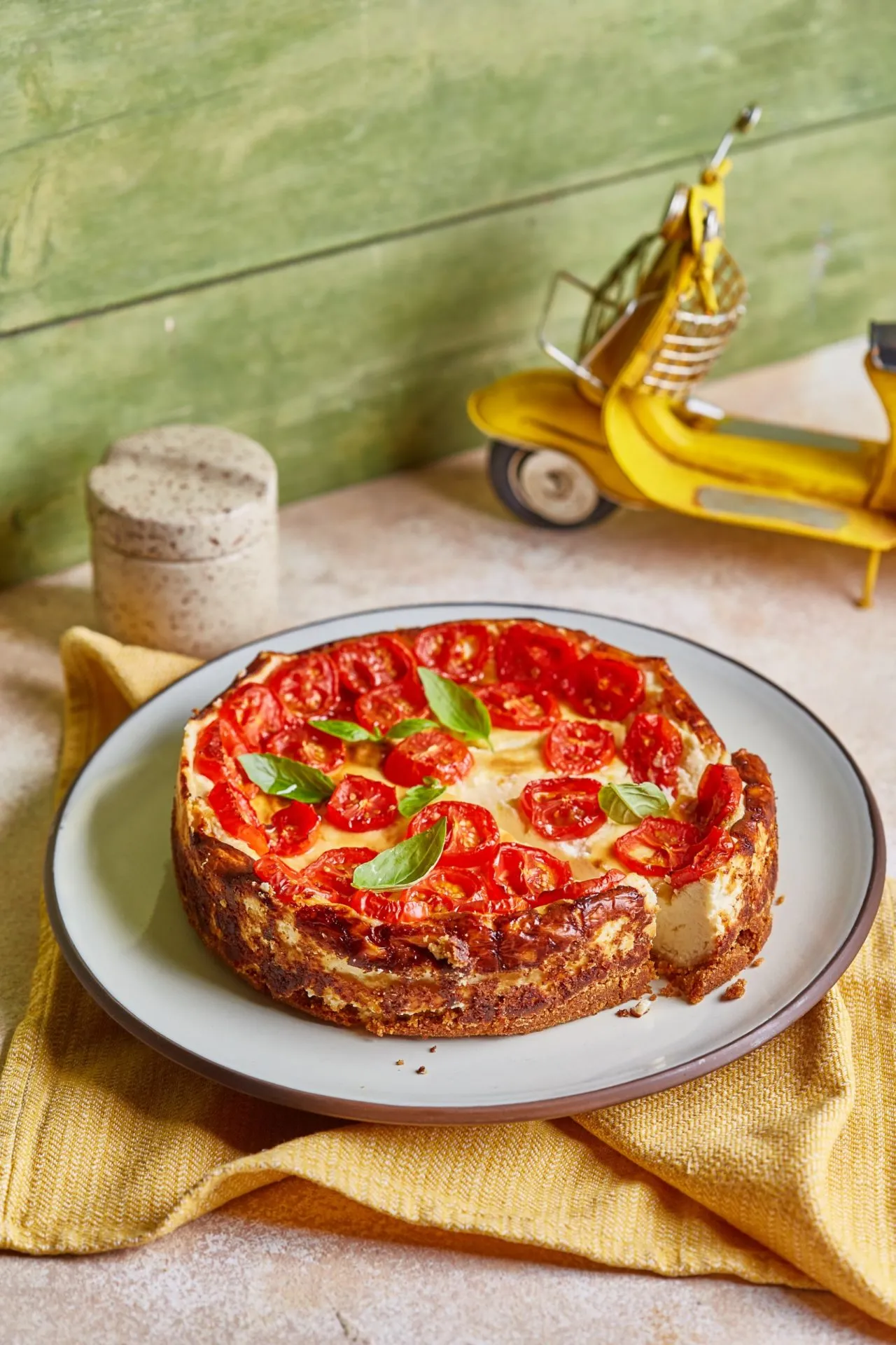 Kivesszük a sütőből a kekszalapot, beleöntjük a krémet, és visszarakjuk fél órára. Felszeleteljük a koktélparadicsomot, és ha letelt az idő, ezt is rápakoljuk a sajttortára. További 35-40 percet sütjük.