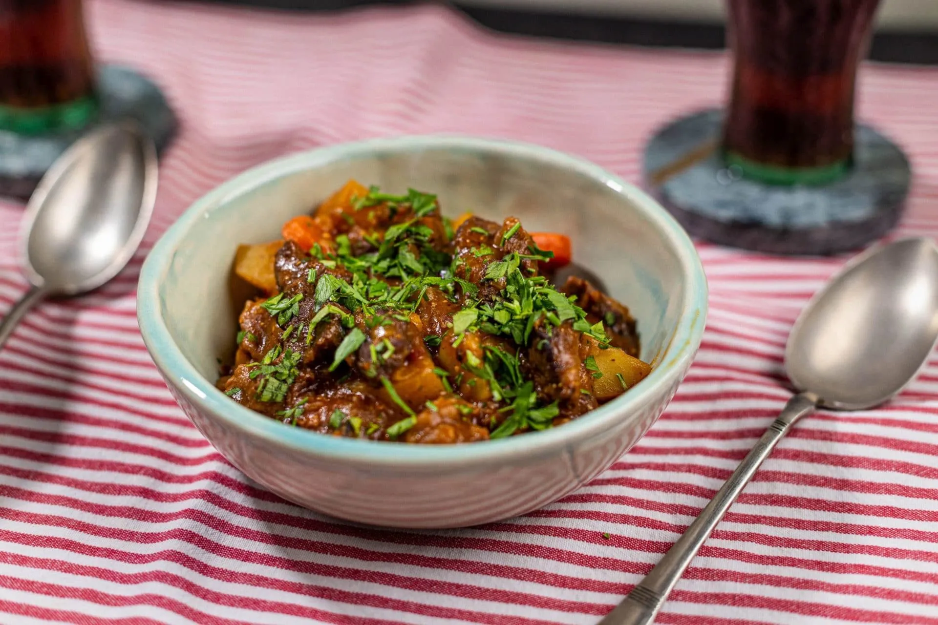Hozzáadjuk a mustárt és a cukrot, sózzuk, borsozzuk, rádobunk néhány ág kakukkfüvet és a babérlevelet, elkeverjük, felöntjük annyi vízzel, hogy ellepje, majd egy órán keresztül fedő alatt főzzük. Ekkor jöhet bele a felkarikázott répa és póréhagyma, valamint a felkockázott burgonya, és most már fedő nélkül, további 60-90 percig főzzük, vagy amíg a hús meg nem puhul. Ha szükséges, sózzuk és borsozzuk. Apróra vágott petrezselyemmel tálaljuk.