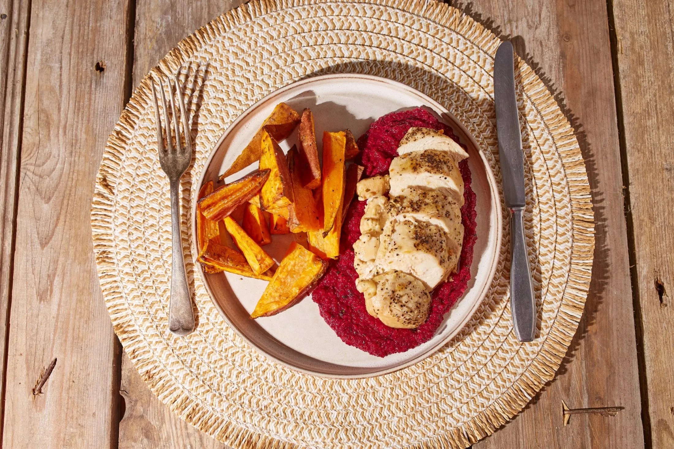 A céklapesztó elkészítéséhez a céklát alufóliába csomagoljuk, és 200 fokra előmelegített sütőbe tesszük, 40 perc után pedig mellérakjuk a megmosott, 5-7 centis hasábokra vágott édesburgonyát, amit egy kis sóval, borssal, olajjal összeforgatunk. További fél órán át sütjük, így a cékla és a köret egyszerre fog elkészülni.