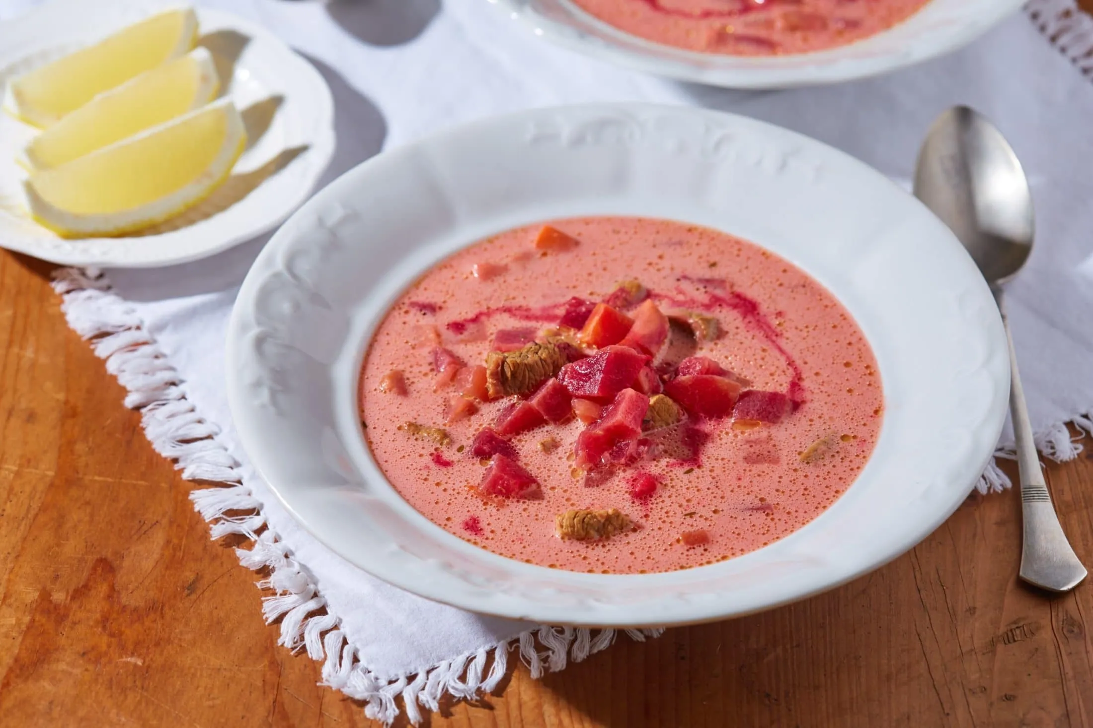 Amikor a leves már majdnem elkészült, hozzádobjuk a megsült, szintén egycentisre kockázott céklát is, majd beleöntjük a tejszínt, forraljunk rajta egyet, és a citrom segítségével beállítjuk a leves fanyarságát. Fél citrom nyugodtan mehet bele, a másik felét pedig cikkekre vágjuk, és a leves mellé tálaljuk. Opcionálisan friss tárkonyt vagy petrezselymet szórhatunk a levesbe.