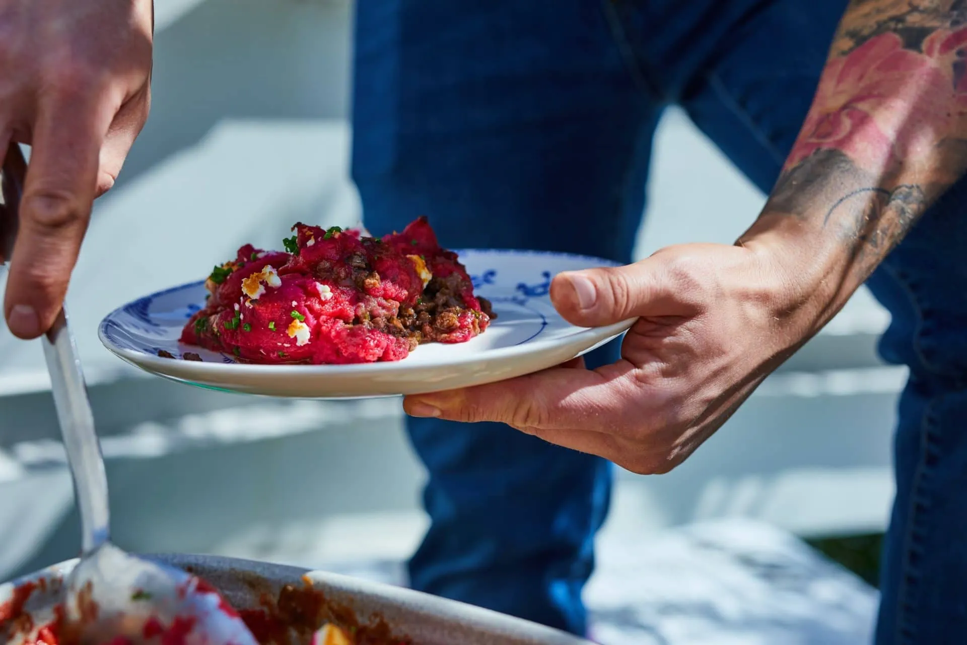 Egy kb. 30 x 30 cm-es jénaiba tesszük a ragut, rányomjuk a céklás burgonyapürét és megszórjuk a fetával. 230 fokra előmelegített sütőben 15-20 perc alatt megsütjük, majd kivesszük és megszórjuk az apróra vágott snidlinggel. Hagyjuk 10 percet pihenni, és fogyasztjuk.