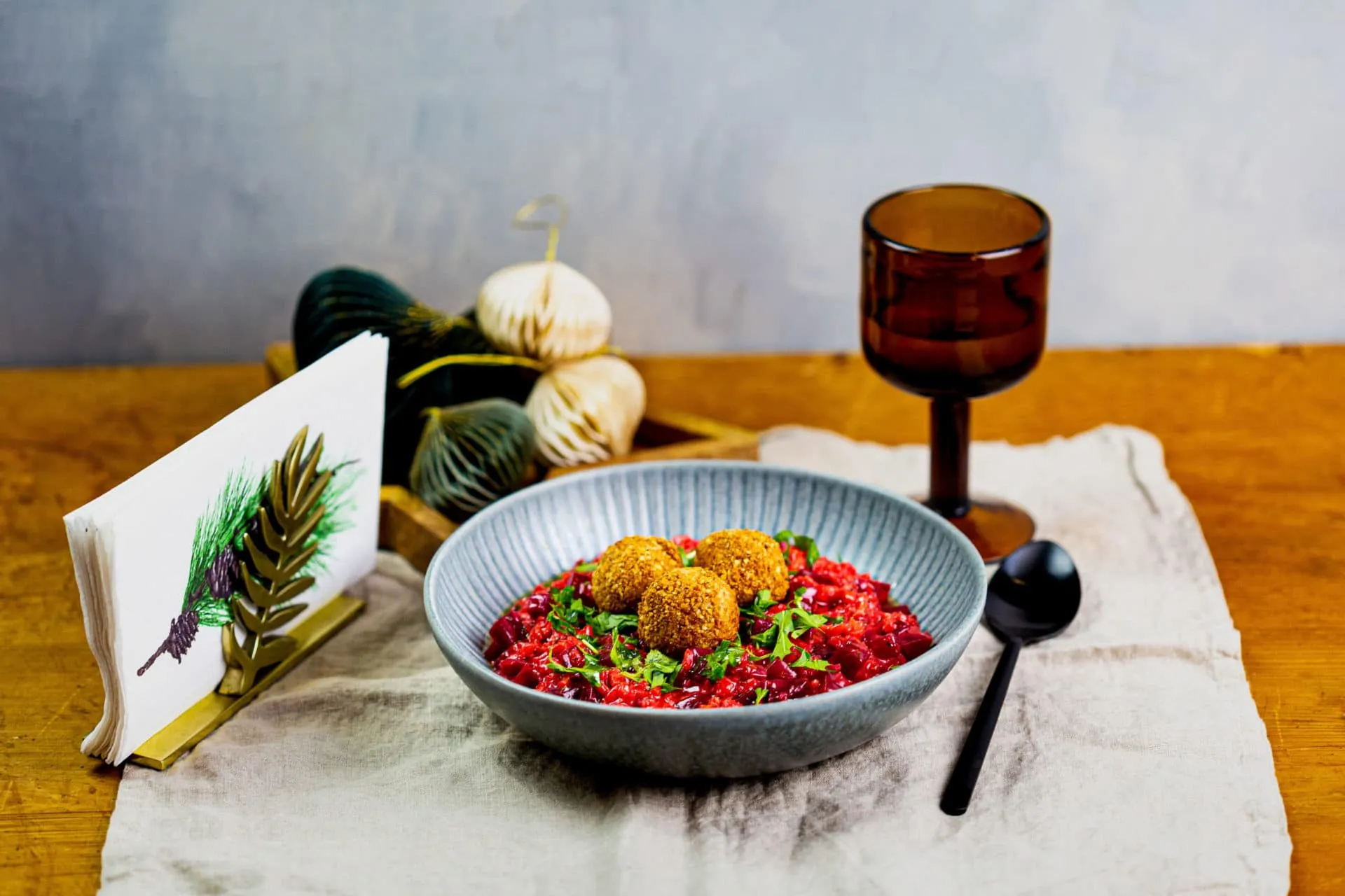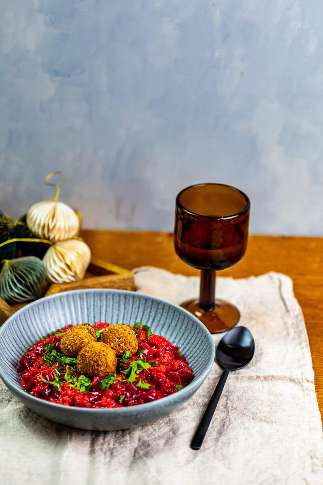 A cékla héját lehúzzuk, majd felkockázzuk (a cékla feldolgozásához érdemes gumikesztyűt használni, mert mindent is lilára fest!). Közben figyelünk a rizottóra, és nem felejtjük el, hogy kevergetni kell! Beleszórjuk a céklakockákat, felöntjük alaplével, készre pároljuk a rizst, majd meghintjük reszelt parmezánnal, lekapcsoljuk a főzőlapot, és belekeverjük a hideg vajat, amitől extra krémes lesz az egész. Félretesszük 2-3 percre, amíg kisütjük a kecskesajtgolyókat.
