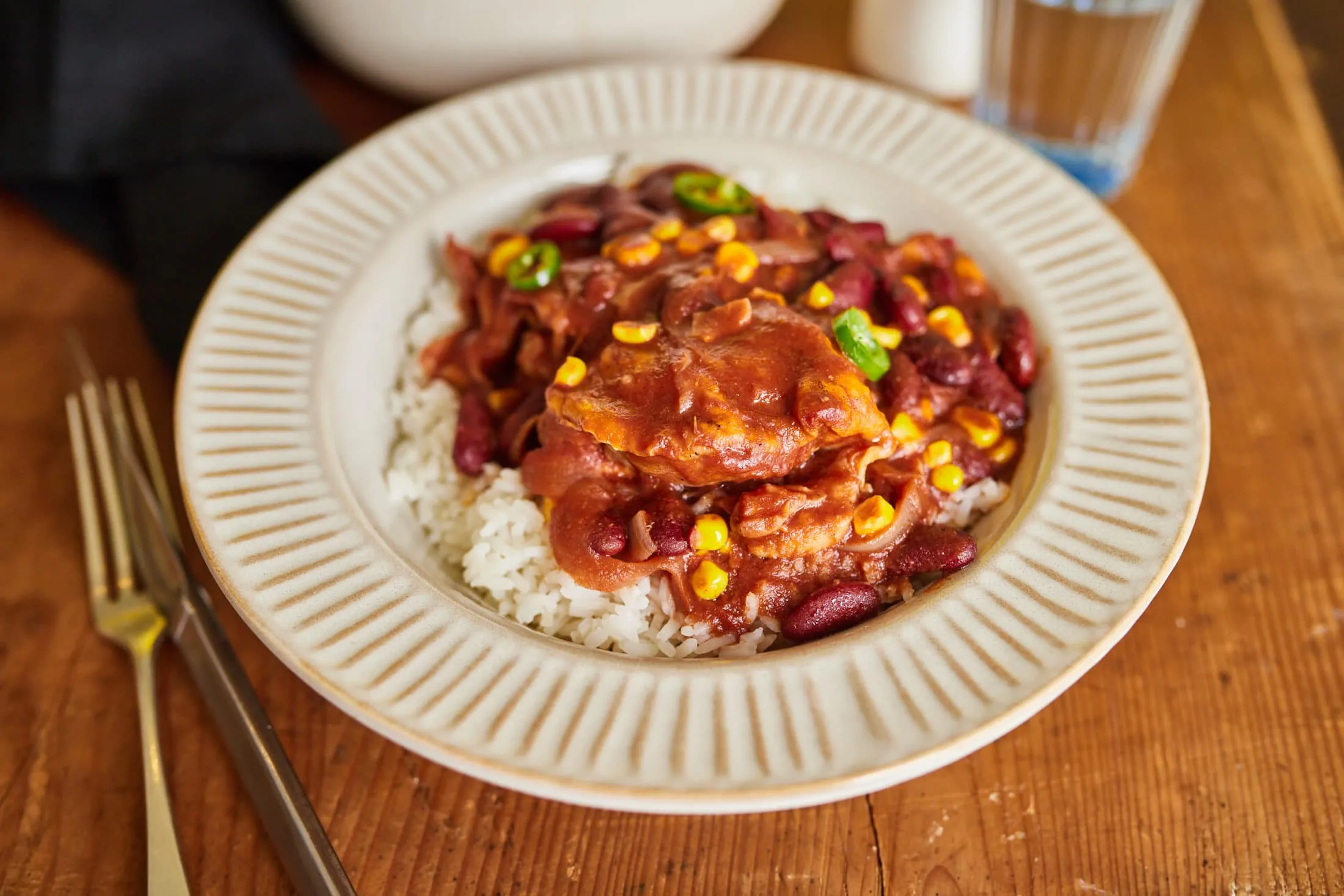 A passatában elkeverjük a chilipaprikát, a kakaóport, a fahéjat, az oregánót, sót, borsot és felöntjük vele a csirkecombokat. Lefedjük és 180 fokos sütőben 50 percig pároljuk. Amikor letelt az idő, levesszük róla a fóliát, felöntjük a sörrel, hozzáadjuk a lecsöpögtetett kukorica- és babkonzervet, majd visszatesszük a sütőbe további 15-20 percre. Kenyérrel vagy rizzsel tálaljuk, én az utóbbit választottam.