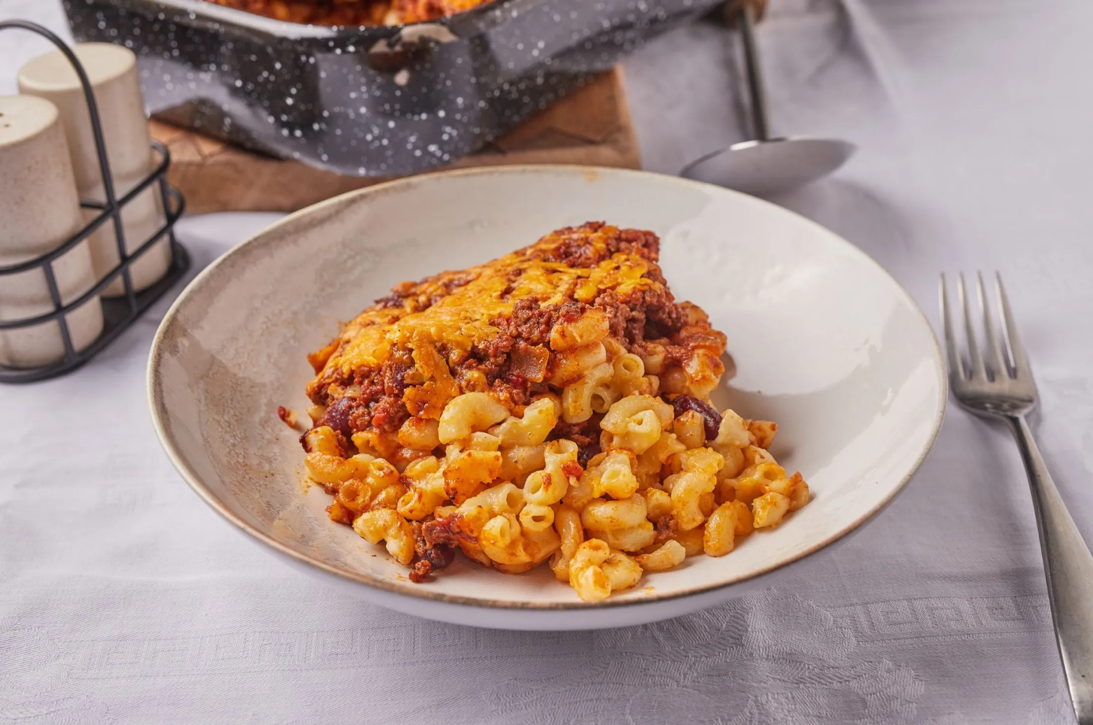 Egy közepes tepsi aljára rakjuk a sajtos tésztát, rászedjük a chilis babot, megszórjuk reszelt sajttal, és 200 fokos sütőben 25-30 perc alatt megsütjük.