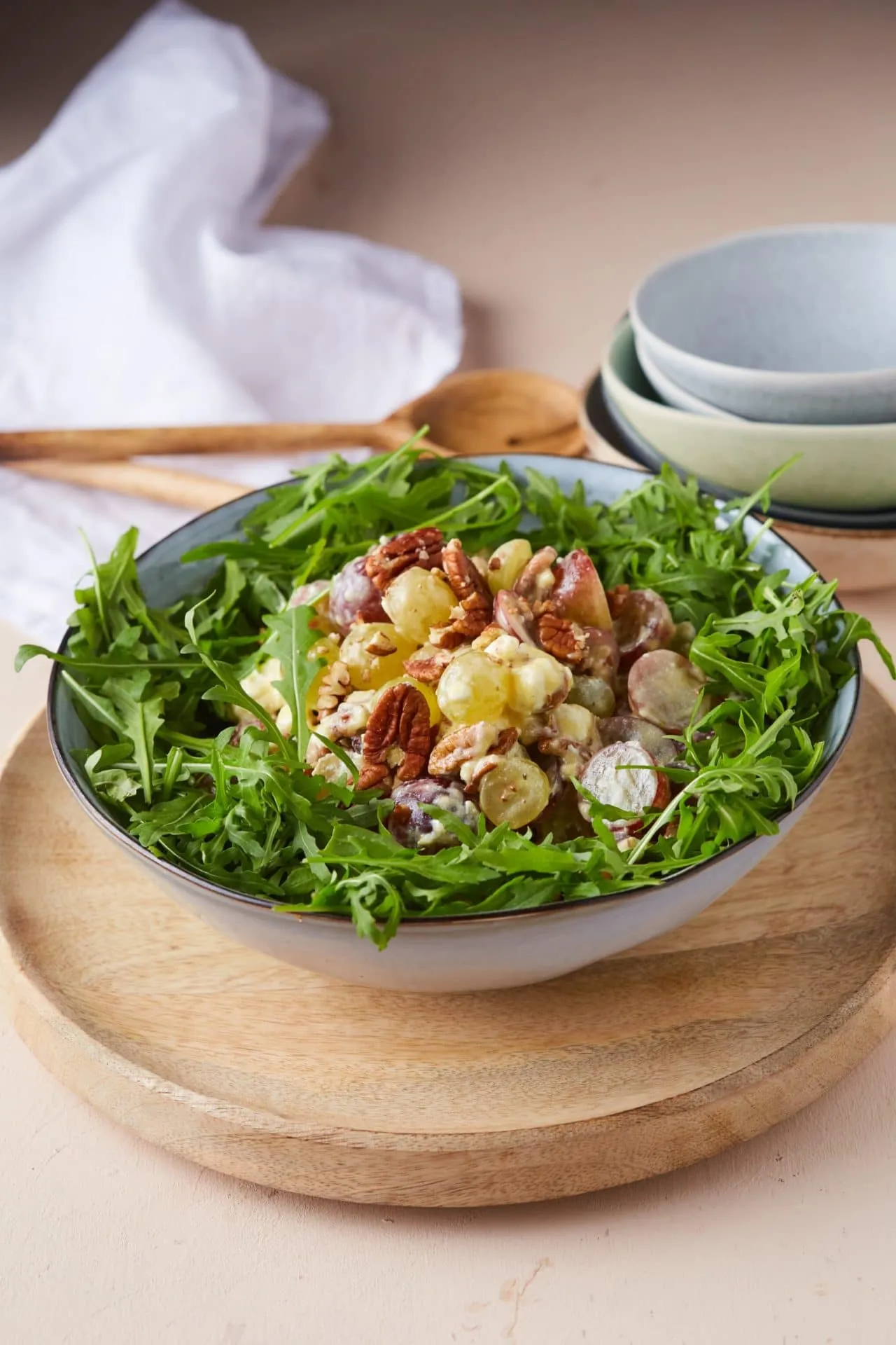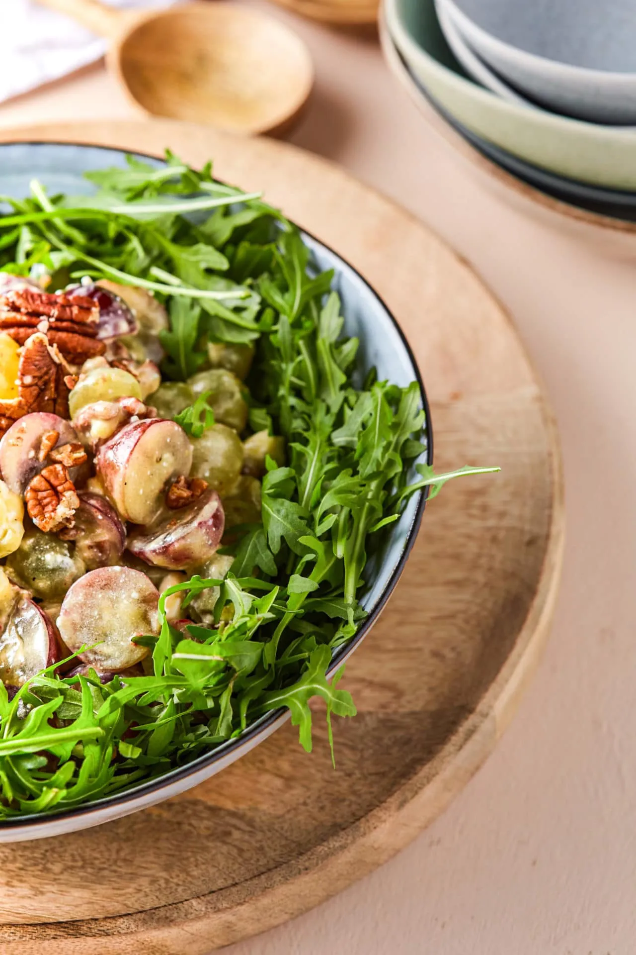 A szőlőket tetszőlegesen szeleteljük, félbevágjuk, pár darabot egészben hagyunk. A chilit magjától és erétől megfosztva vékony csíkokra vágjuk. A pekánt kézzel rusztikusan nagyobb darabokra morzsoljuk. A fetát felkockázzuk. A szőlőt, a chilit, a pekánt és a fetát kb. 6 ek vinaigrette-tel összekeverjük egy tálban. A rukkolát koszorúformában egy tálba tesszük, majd a közepére halmozzuk a szőlősalátát.