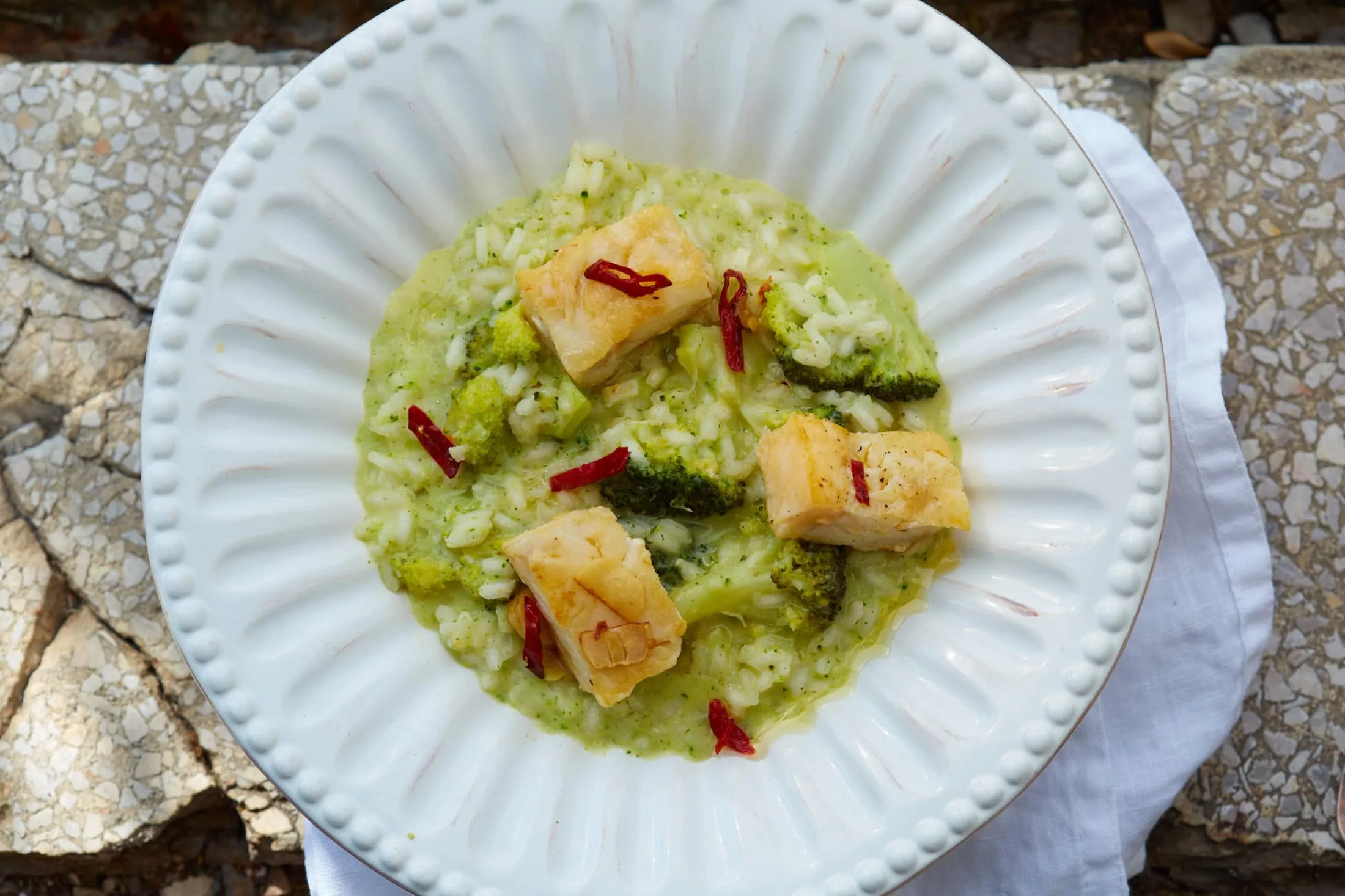 A tőkehalat 2 szeletre vágjuk, sózzuk, borsozzuk. Egy serpenyőben az olívaolajon elkezdjük pirítani a szeletekre vágott chilit. Rádobjuk a felszeletelt fokhagymát, majd a halszeleteket is rátesszük, és oldalanként 3-4 percig sütjük, így nem fog túlsülni. A tőkehalat a brokkolis rizottóval tálaljuk.