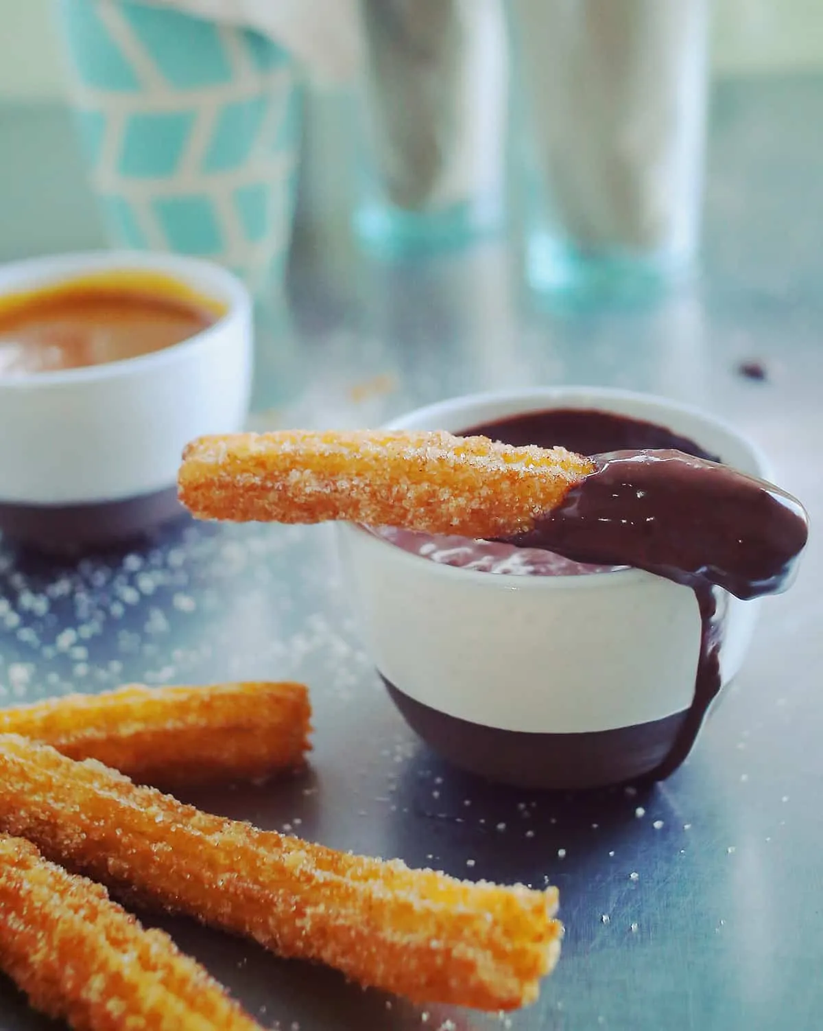 A csokiöntethez a keményítőt elkeverjük 125 ml hideg tejben. A maradék tejet kis lábosba tesszük, és alacsony láng felett felolvasztjuk benne a darabokra tört csokoládét. A csokis tejhez adjuk a keményítős tejet, a kristálycukorral, a fahéjjal, a sóval és a kakaóval ízesítjük. Majd közepes lángon 15 percig főzzük (amíg besűrűsödik). Még forrón mártogassuk bele a churrost, úgy az igazi!