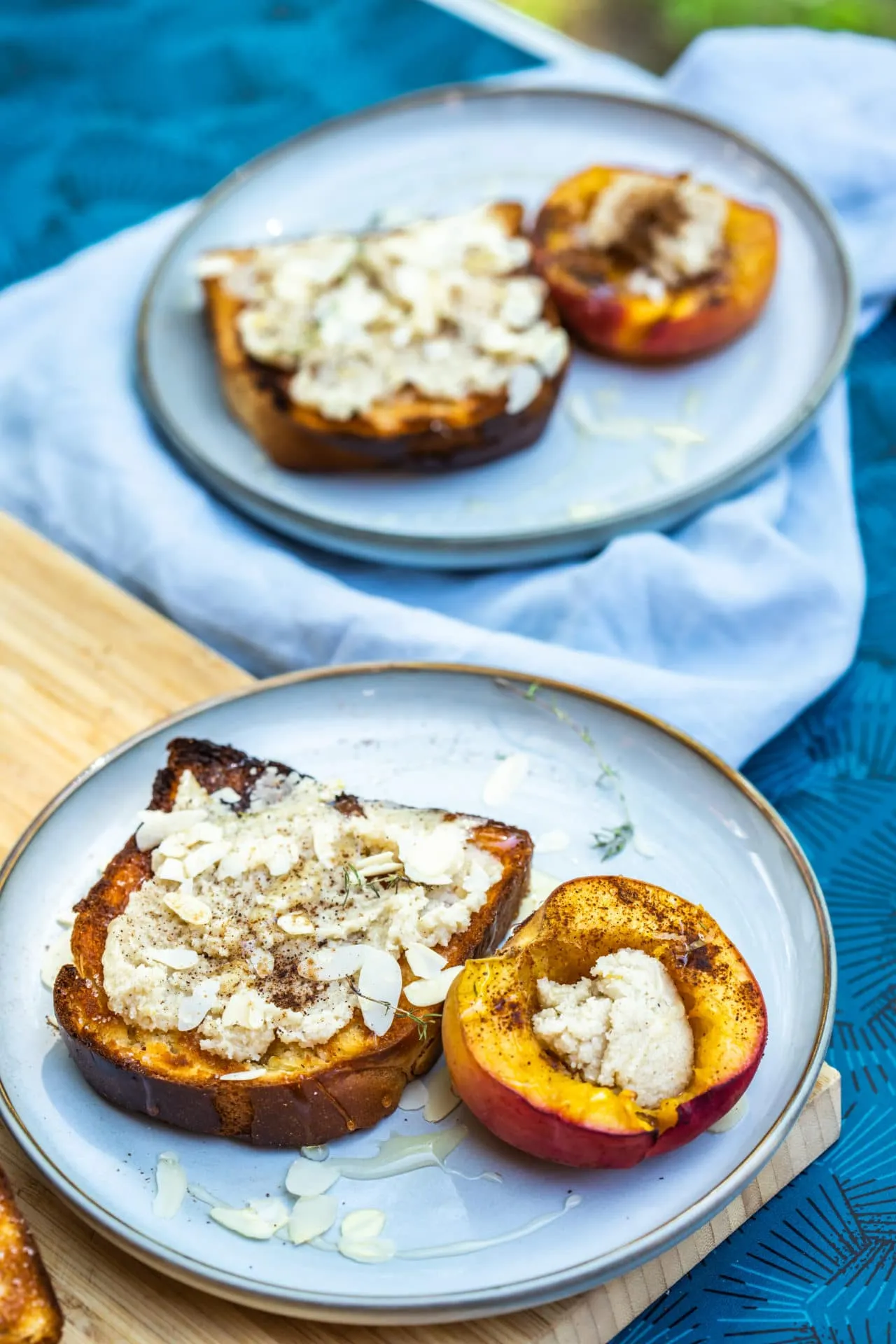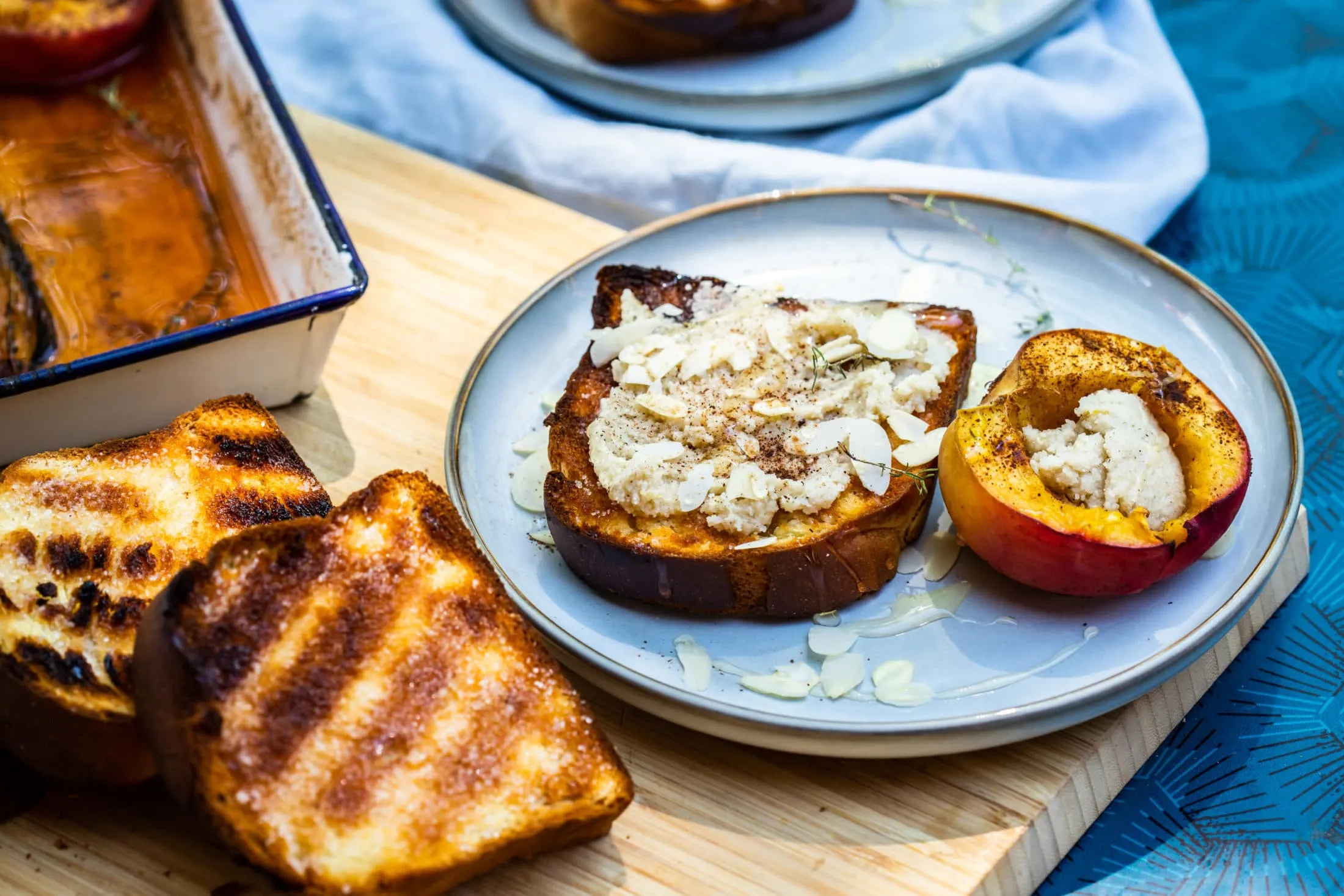 Közben a mandulakrém hozzávalóit egy nagy tálban összekeverjük. A kalácsszeleteket vékonyan megvajazzuk, megszórjuk cukorral, és pár percig ezzel a felével lefelé pirítjuk a grillen, majd megfordítjuk, és aranybarnára pirítjuk a másik felüket is. A kalácsokat megkenjük a mandulakrémmel, a sült barackok belsejébe is rakunk 1-1 teáskanálnyit, szeletelt mandulát és egy pici fahéjat szórunk rá, és meglocsoljuk kevés mézzel.