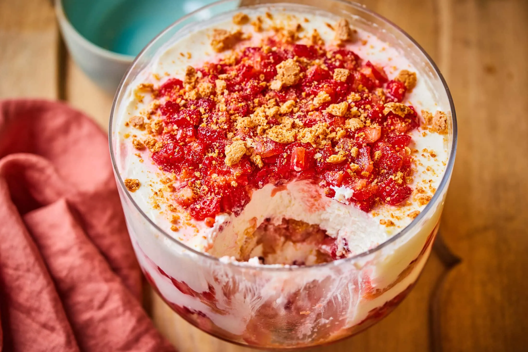 A marinált epret leszűrjük, és a visszamaradt lével fogjuk meglocsolni a babapiskótákat. Egy magasabb falú edény aljába rakunk egy réteg piskótát, meglocsoljuk az eper levével, rárakjuk az eper 1/3-át, és a krém felét. Jöhet rá egy újabb réteg piskóta, meglocsoljuk a maradék lével, rárakunk egy következő adag epret, erre pedig jöhet a maradék krém, végül a maradék eper. Ha szeretnénk, egy kis keksszel díszíthetjük. Legjobb, ha egy napot áll a hűtőben (de minimum 2-3 órát), és kész is.