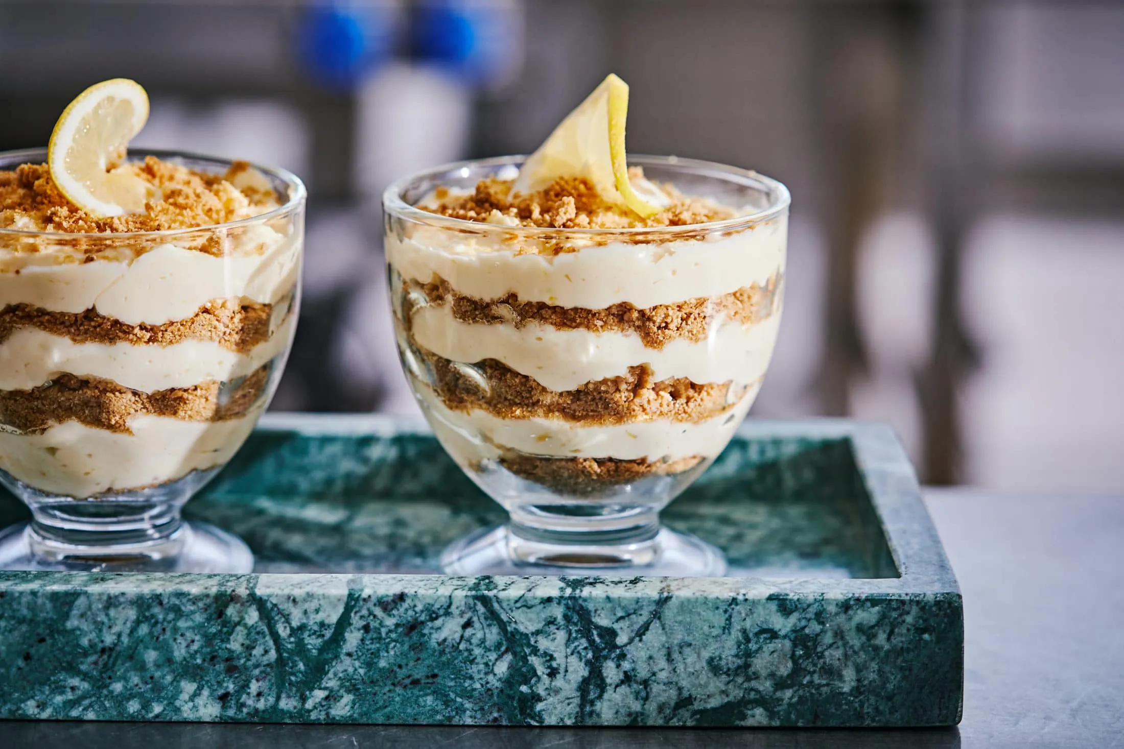 2 vagy 4 pohárba rétegezzük a citromos krémet és a zabkekszet. 1 órára hűtőbe tesszük, hogy összeérjenek az ízek, és tálalás előtt citromkarikával is díszíthetjük.
