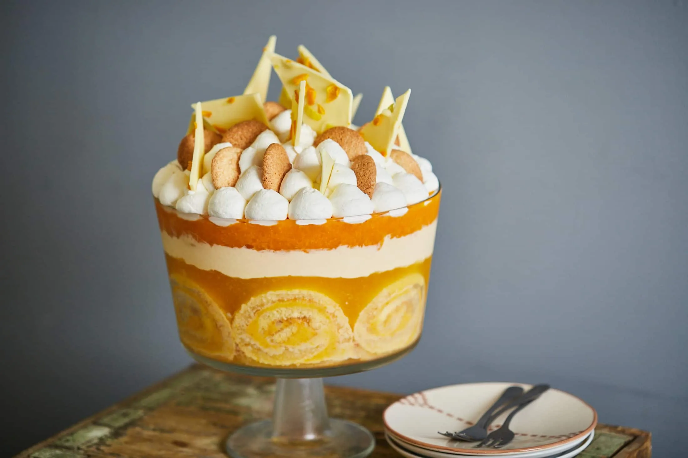 A díszítéshez egy tálban, vízgőz felett felolvasztjuk a fehér csoki kétharmadát, majd belekeverjük a maradék mennyiséget, és ha ez elolvadt benne, egy sütőpapíros vágódeszkán 2-3 mm vastagságban elsimítjuk, majd zöldséghámozóval vágott kis darab citrushéjakkal megszórjuk. Bedobjuk a fagyasztóba dermedésig, majd széttörjük, és az így kapott csokidarabokkal, illetve amaretti kekszekkel díszítjük a trifle tetejét.