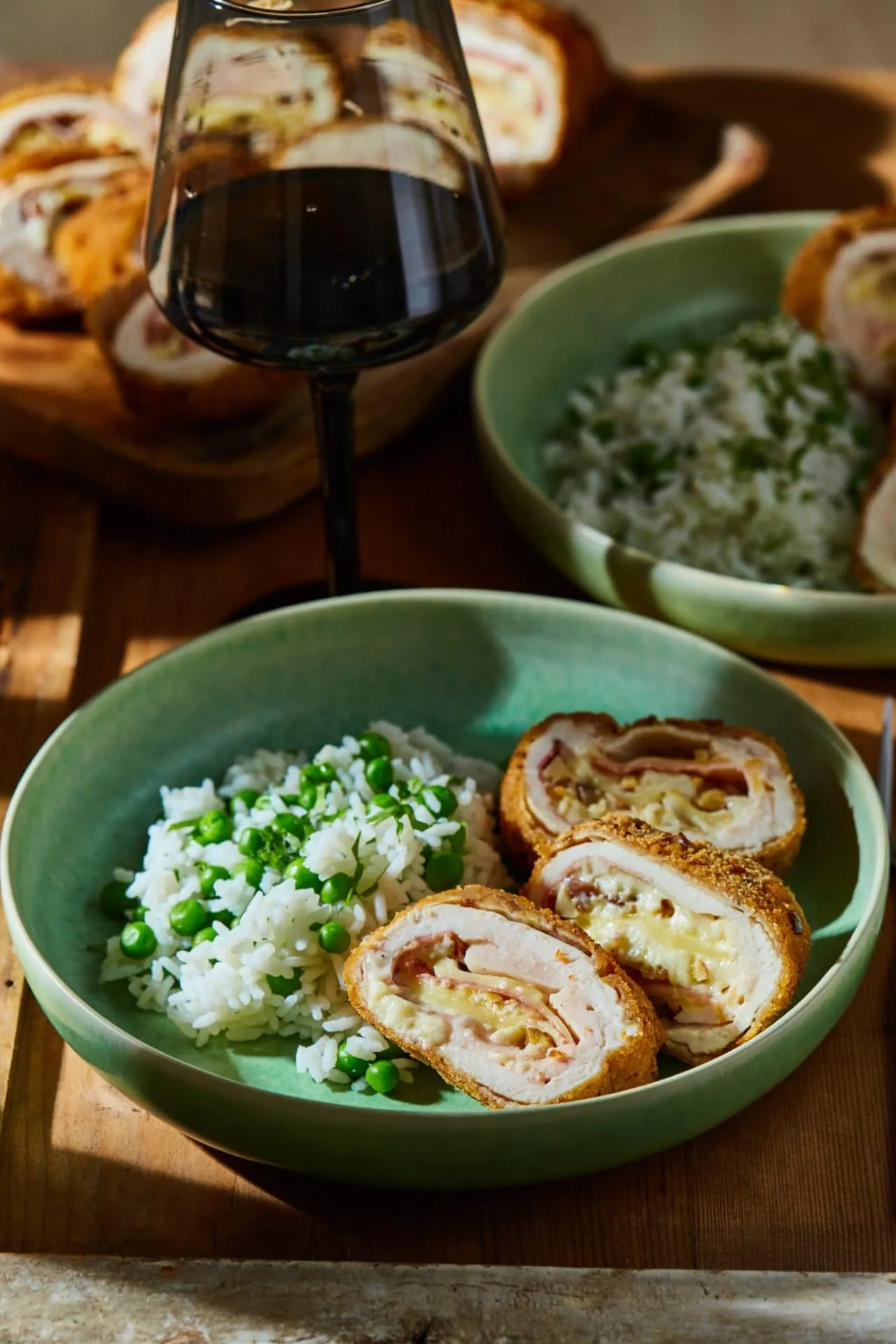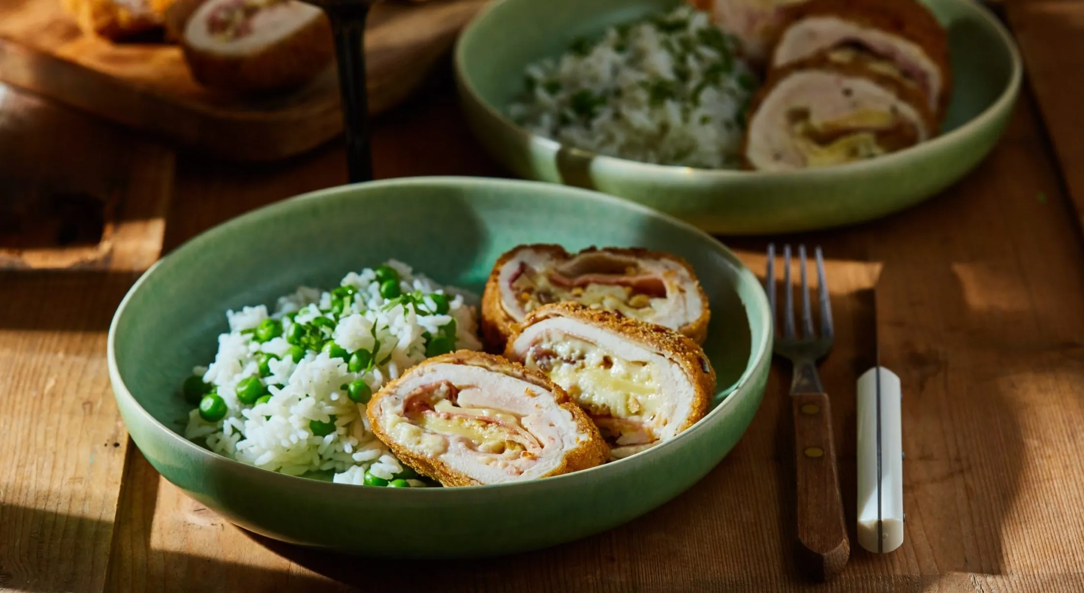 A csirkemelleket késsel szétnyitjuk, majd enyhén megklopfoljuk. Ezután sózzuk, borsozzuk, és az egyik képzeletbeli oldalának a közepére elhelyezzük a tölteléket. Ehhez a sonkákat félbevágjuk, és alulra egy szeletet teszünk belőle, rákanalazunk egy kanálnyi besamelt, amibe beleszórunk egy csipetnyi aprított gesztenyét, ezt megszórjuk sóval, borssal, erre pedig egy szelet sajtot fektetünk. Aztán ezt még egyszer megismételjük, és a csirke kilógó részeivel körbehajtogatjuk a tölteléket. Ezután a töltött húsokat egy fél órára betesszük a fagyasztóba, hogy kidermedjenek annyira, hogy könnyen panírozhatóak legyenek.