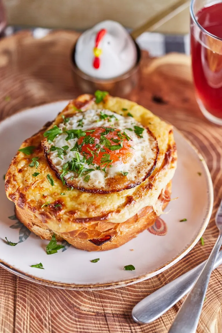 A kész besamelt rákanalazzuk az elősütött szendvicsek tetejére, mehet rájuk még egy adag reszelt sajt és irány a 200 fokra előmelegített sütő felső-grill fokozaton. Kb. 15-20 perc és gyönyörű aranybarnák lesznek. Közben készítünk 2 tökéletes tükörtojást és a kész szendvicsek tetejére csúsztatjuk őket.