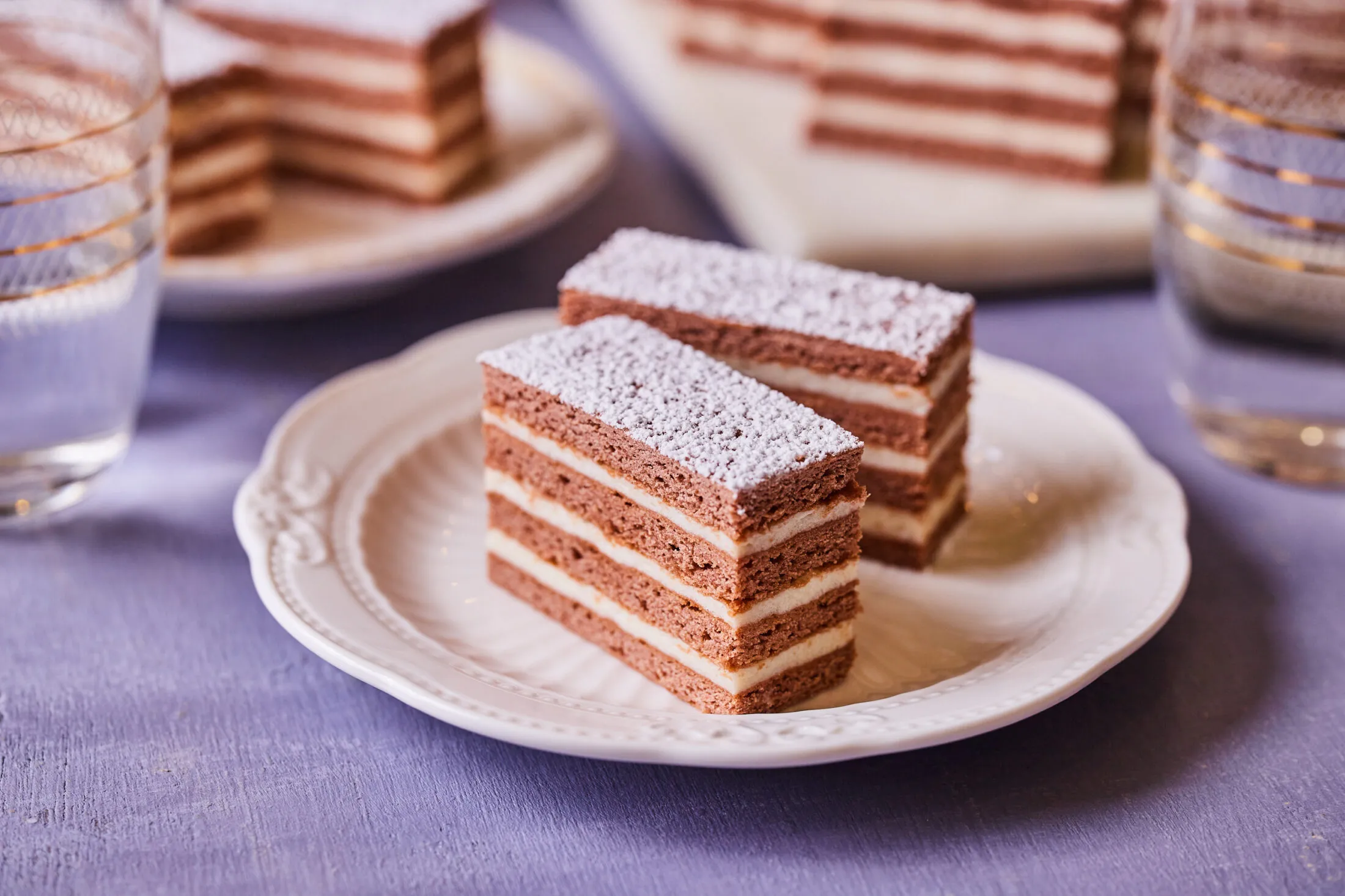 A kihűlt tésztalapokat kettévágjuk, így 4 db lapot kapunk, amiket megtöltünk a krémmel, és egymásra rétegezzük őket. Lefóliázzuk a sütit, a tetejére rakunk egy vágódeszkát nehezéknek, majd hűtőbe tesszük 1-2 éjszakára, csak ezután szeleteljük, végül pedig megszórjuk porcukorral.