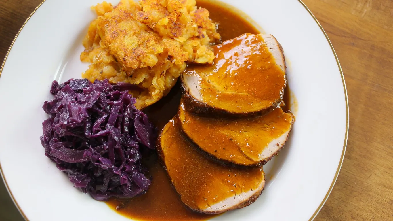 Egy forró serpenyőben megolvasztjuk a sertészsírt, majd megpároljuk és lepirítjuk rajta a felaprított hagymát. Összeforgatjuk vele a pirospaprikát és a főtt krumplit, majd egy krumplinyomóval összetörjük az egészet. Sózzuk, borsozzuk és nagy lángon alaposan lepirítjuk.Egy pár szelet karajt egy tányérra teszünk, meglocsoljuk a pecsenyelével, majd pirított burgonyát és párolt káposztát teszünk mellé.