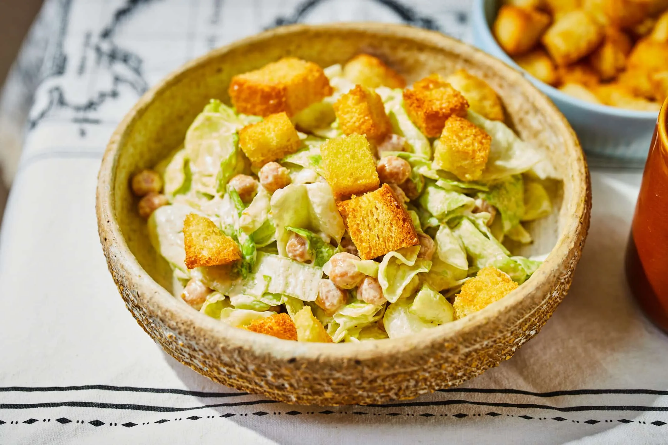 A csicseriborsós cézársaláta elkészítéséhez elsőként leforrázzuk a kesudiót és 4 órát hagyjuk puhulni a vízben. Ezután leszűrjük és elkészítjük a cézáröntetünket, amihez a kesudiót krémesre turmixoljuk a növényi tejjel, sóval, borssal, a sörélesztőpehellyel, a fokhagymával, juharsziruppal, a citrom kifacsart levével és a mustárral.