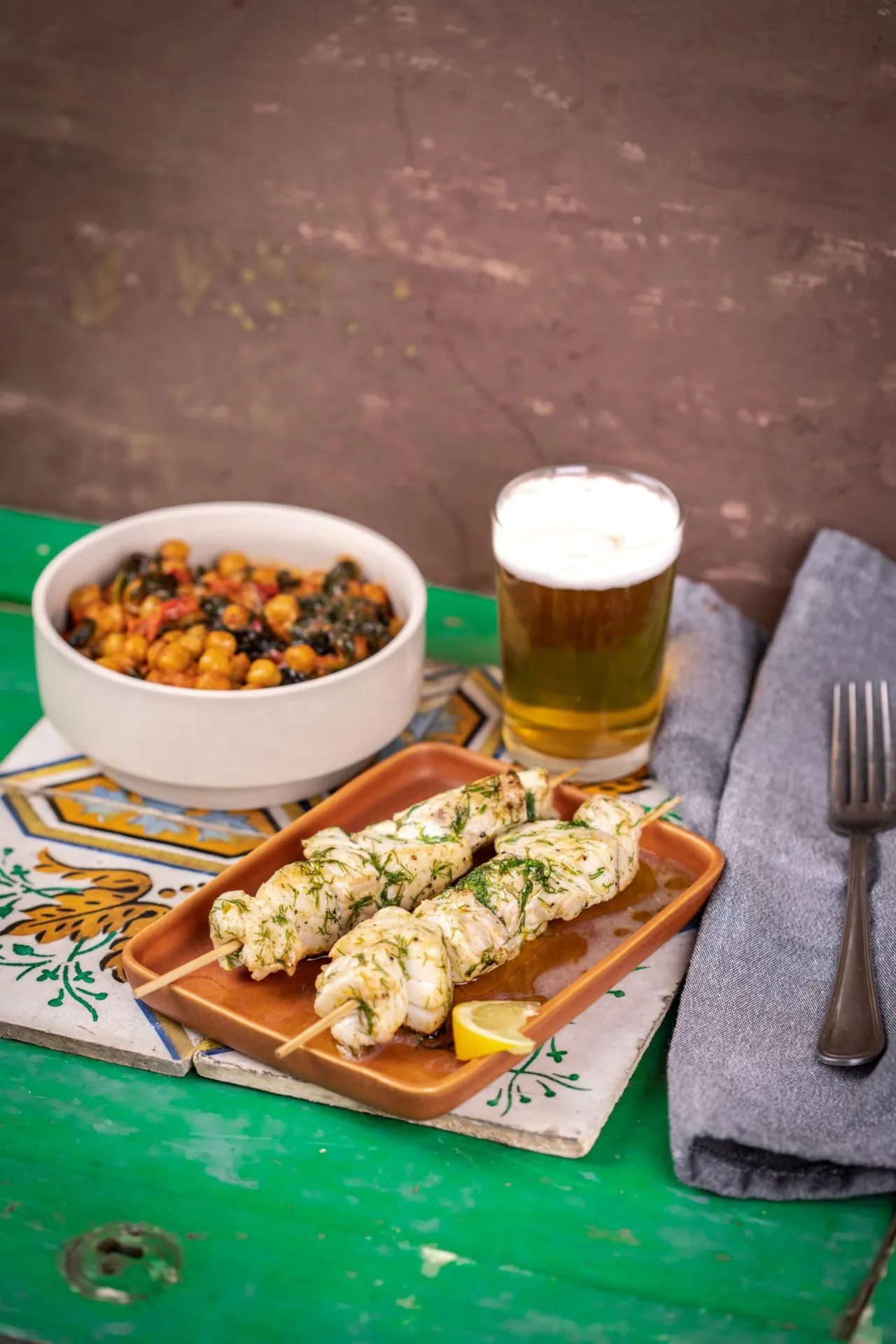 A nyárshoz a halat nagy kockákra vágjuk, összeforgatjuk a vaj kivételével mindennel, és hagyjuk állni egy kicsit. Ezután egy serpenyőben felolvasztjuk a vajat egy kevés olajjal és megsütjük a nyársakat. A csicseris ragut ezzel a halnyárssal tálaljuk.