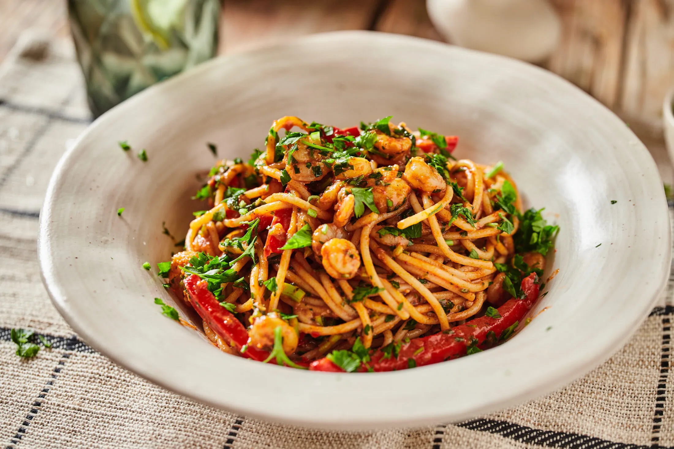 A csípős garnélás spagetti egy brutál ízes kaja, amit negyedóra alatt összedobhattok. Elkészítéséhez először a tésztát sós, lobogó vízben 7-8 perc alatt al dentére főzzük. Mielőtt leszűrnénk, kimentünk belőle 200 ml tésztafőzővizet és félretesszük. A megfőtt tésztát átmossuk hideg vízzel és meglocsoljuk 1 ek olajjal, hogy ne ragadjon össze.