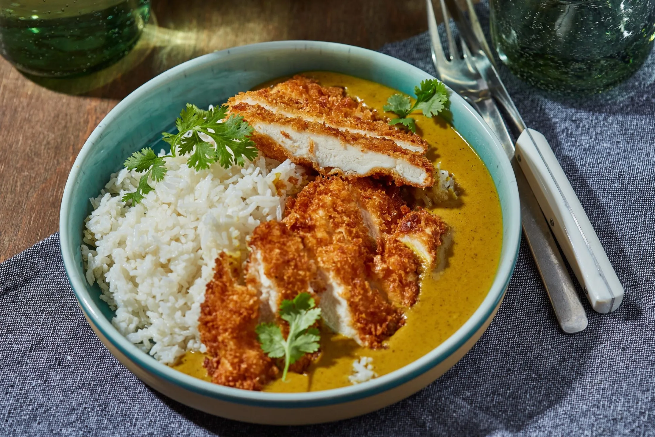 A rizst megfőzzük. A csirkemelleket vízszintesen félbevágjuk, sózzuk, borsozzuk, majd a szokásos technikával panírozzuk (liszt, tojás, panko morzsa). Bő, forró olajban 5-8 perc alatt kisütjük. Hagyjuk egy kicsit pihenni, majd felvágjuk, főtt rizzsel és a mártással tálaljuk.