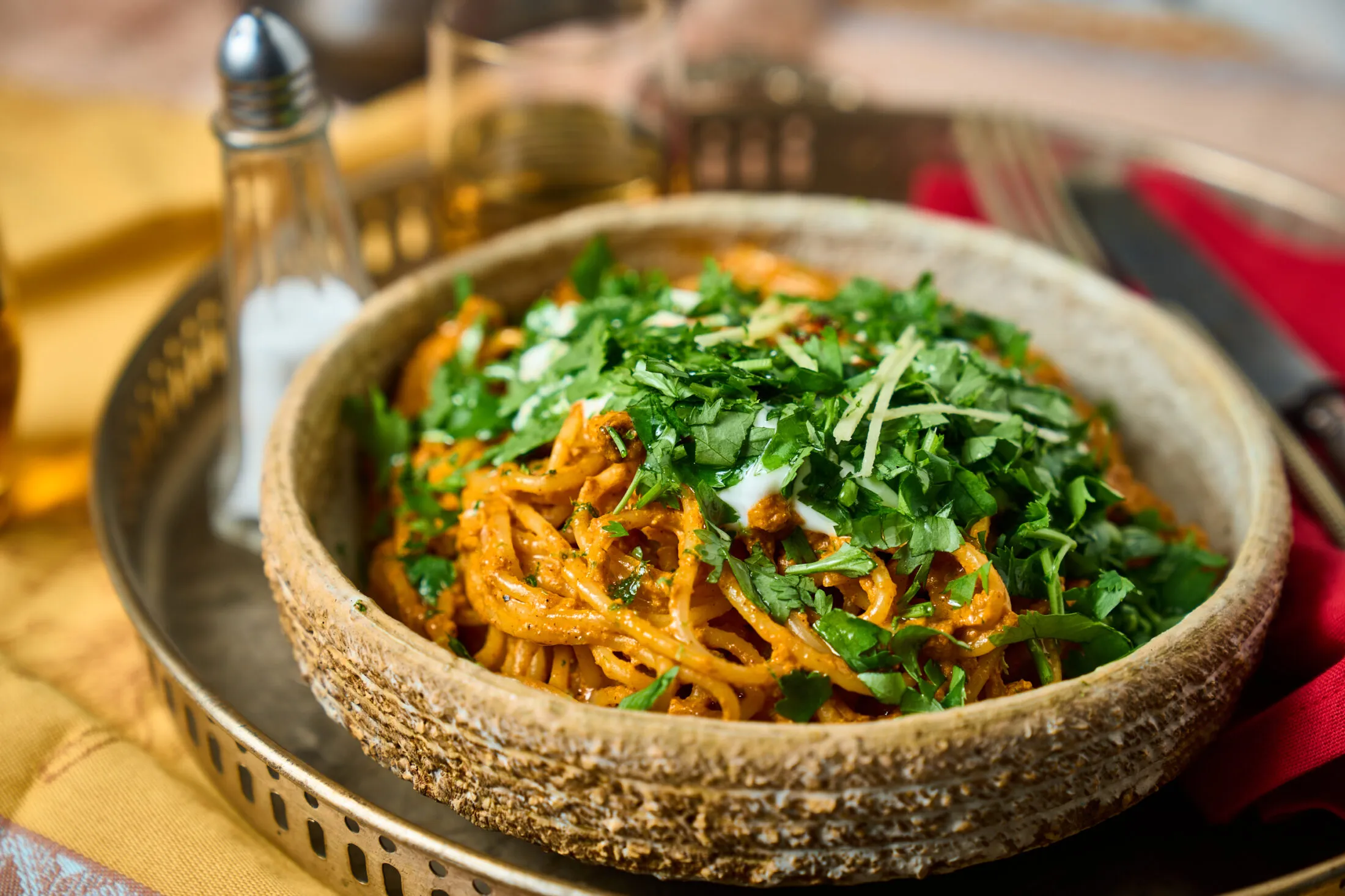 A megpirult csirkét belekeverjük a joghurtos raguba, majd a spagettit bő, sós vízben al dentére főzzük, leszűrjük és ezt is a raguhoz keverjük. A kész tésztára tálaláskor joghurtot kanalazunk és megszórjuk Cayenne-borssal, valamint aprított korianderrel. A tetejét vékony csíkokra vágott gyömbérrel díszítjük és megpergetjük a lime lereszelt héjával.