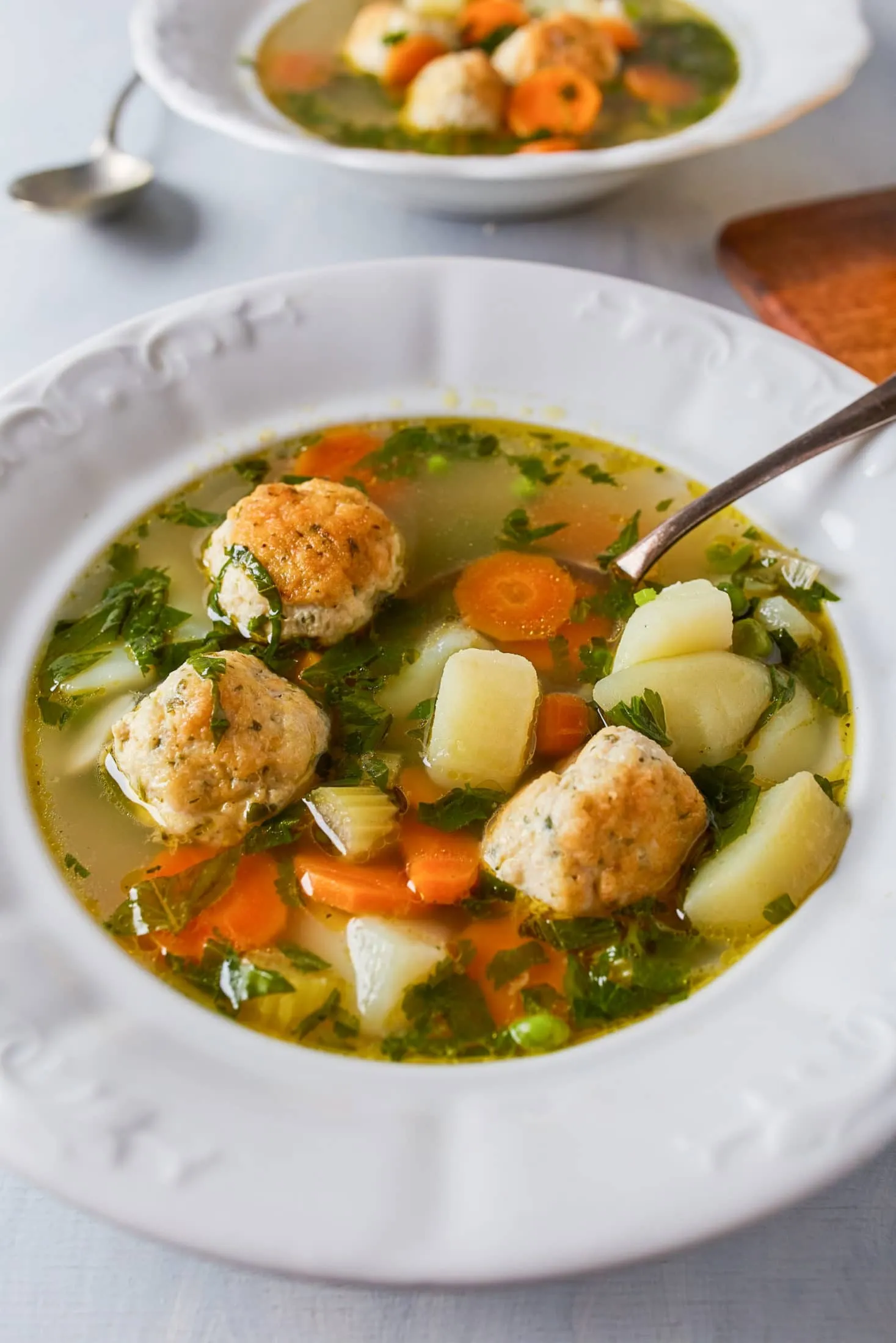 Ezután a lábasban, amiben a levest fogjuk főzni, alaposan körbepirítjuk az olajon, kiszedjük, és beledobjuk a kis kockákra vágott zöldségeket, a krumpli és a borsó kivételével. Felengedjük az alaplével, sózzuk, borsozzuk, és addig főzzük, amíg a zöldségek félig meg nem puhultak. Ekkor belerakjuk a krumplit, a húsgolyókat és tovább főzzük, amíg a krumpli félig meg nem puhul. Ekkor jöhet bele a borsó is. Ha minden megfőtt, elzárjuk, és beleszórjuk a zöld fűszereket.