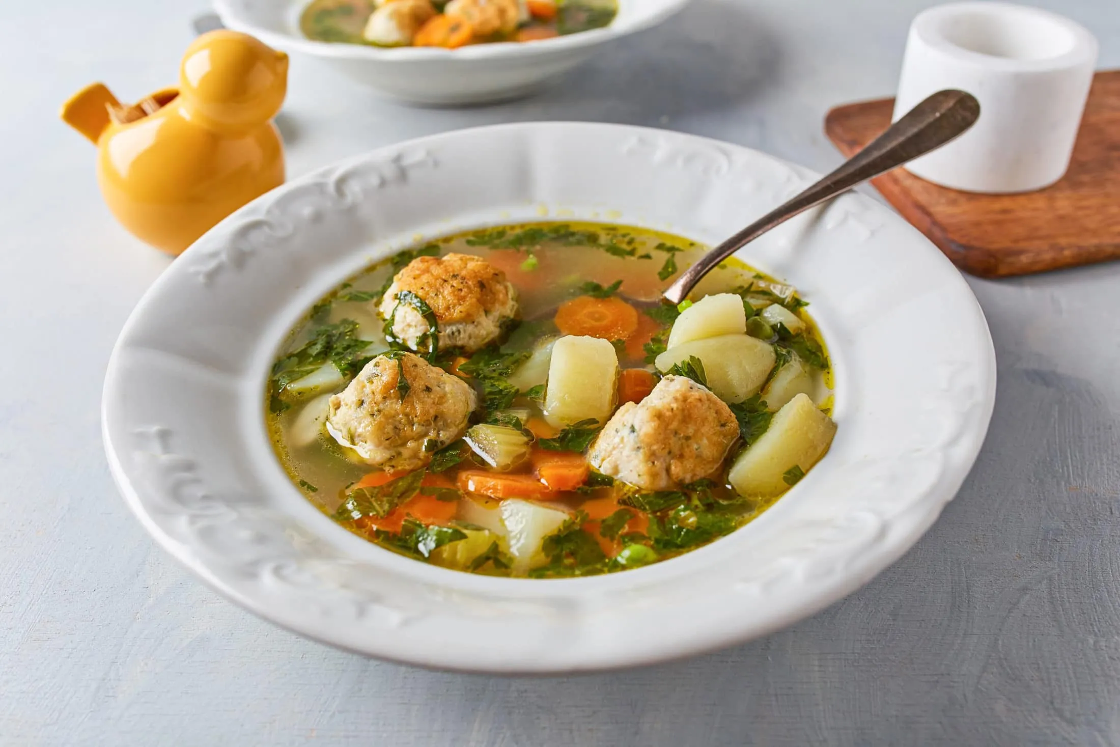 Ezután a lábasban, amiben a levest fogjuk főzni, alaposan körbepirítjuk a golyókat az olajon, kiszedjük, és beledobjuk a kis kockákra vágott zöldségeket, a krumpli és a borsó kivételével. Felengedjük az alaplével, sózzuk, borsozzuk, és addig főzzük, amíg a zöldségek félig meg nem puhultak. Ekkor belerakjuk a krumplit, a húsgolyókat és tovább főzzük, amíg a krumpli félig meg nem puhul. Ekkor jöhet bele a borsó is. Ha minden megfőtt, elzárjuk, és beleszórjuk a zöld fűszereket.