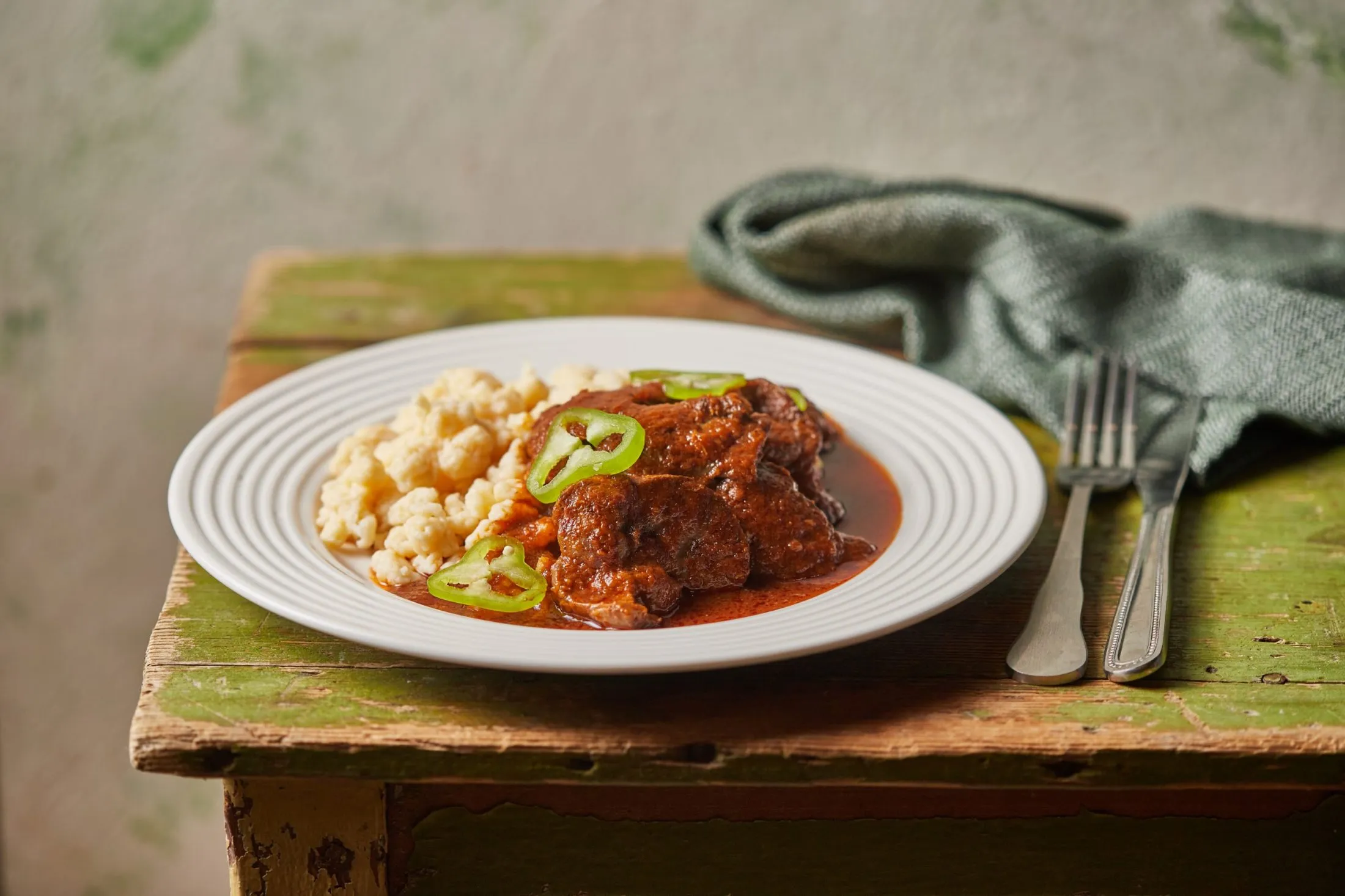 Az utolsó 10 perc előtt egy serpenyőt erős lángon felhevítünk. A májat megtisztítjuk, majd az olajon erősen körbepirítjuk. A végén sózzuk, borsozzuk, megszórjuk a majorannával, és 10-15 perc alatt készre pároljuk az alapban. Nokedlivel és ízlés szerint erős paprikával tálaljuk.