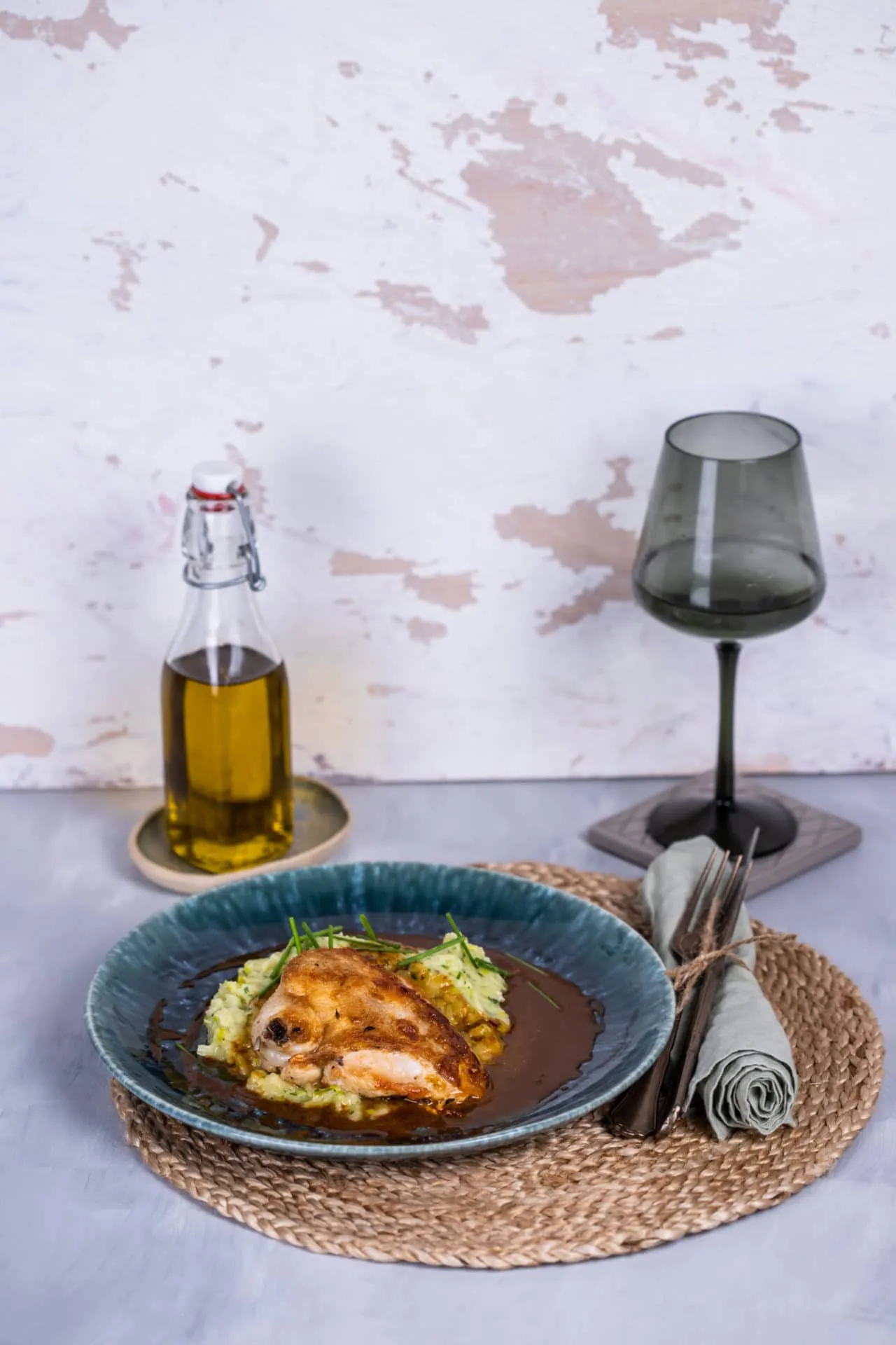 A mártáshoz a csirkealaplé-redukciót, a tejszínt, a sáfrányt és a mustárt összebugyogtatjuk, aztán elzárjuk a hőt. Beledobjuk a vajat, és folyamatos mozgatás mellett felolvasztjuk. Hozzáadjuk a kakukkfüvet, és hagyjuk benne aromatizálódni.