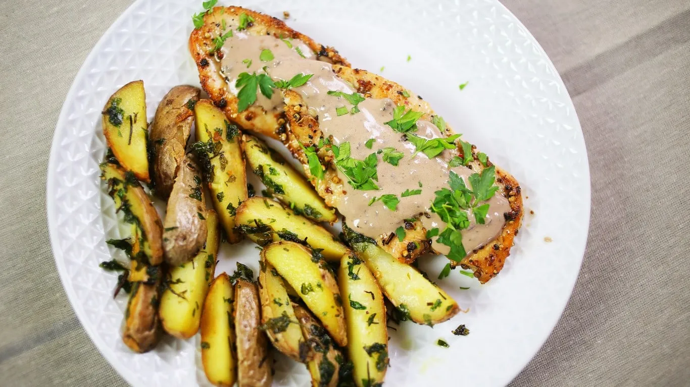 A tarkaborsot mozsárban kicsit összetörjük. A csirkemellet szeletekre vágjuk, olívaolajjal megkenegetjük, sózzuk, majd végül a tarkaborssal bedörzsöljük őket.