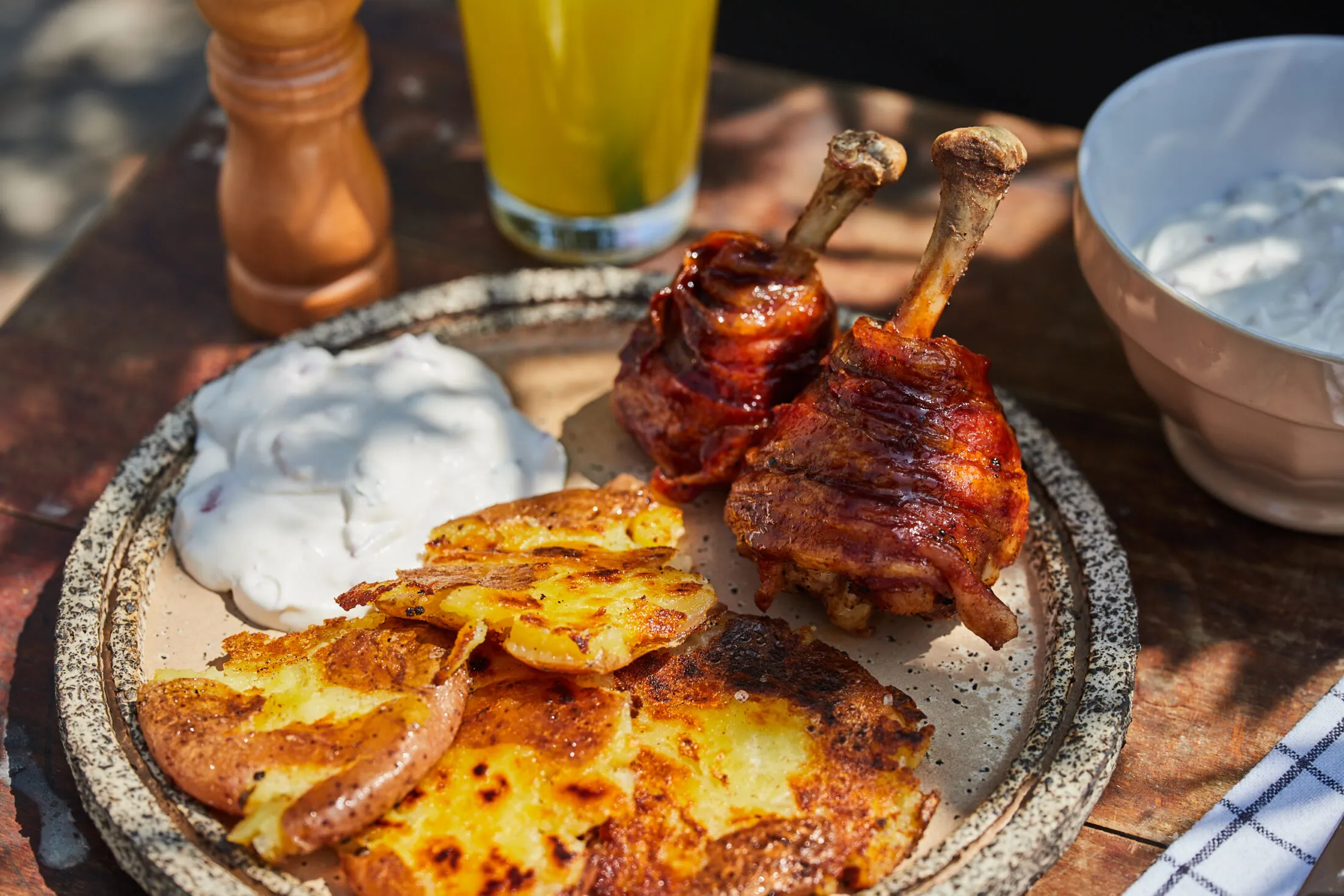 Mikor letelt a csirke sütési ideje, félretesszük a combokat pihenni. Az előfőzött burgonyákat zsírral megkent rostlapra tesszük, egy húspogácsanyomóval összepréseljük, sózzuk, borsozzuk és ropogósra sütjük. A csirkecombokat a mártogatóssal és a ropogós burgonyával tálaljuk.
