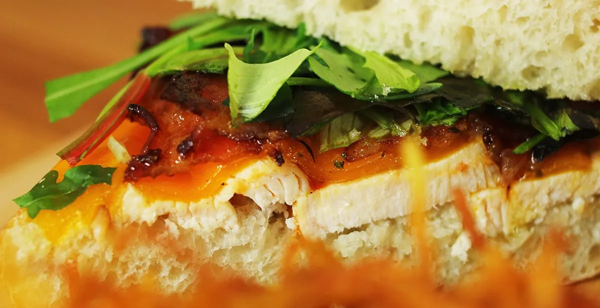 A félbevágott szendvicskenyérbe belepakoljuk a szeletekre vágott sült csirkét, rádobáljuk a kisült bacont és végül betakargatjuk a cheddar sajttal. Így ahogy van bedobjuk újra a sütőbe pár percre, csak amíg megolvad a sajt és jól átforrósodik a kenyér. Egy marék saláta megy még bele, na meg persze mellé a ropogós szalmakrumpli és már lehet is enni!