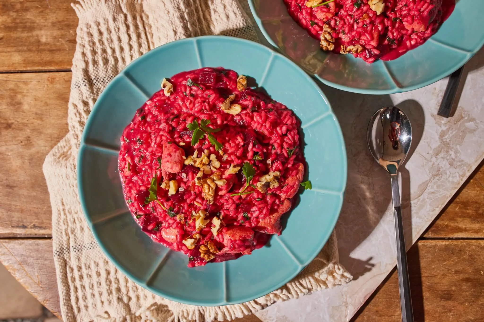 Ha krémes állagúra főtt a rizottó, elzárjuk a hőt, megszórjuk reszelt parmezánnal és aprított petrezselyemmel, majd alaposan elkeverjük. Tálaláskor meghintjük rusztikusra aprított dióval, és pár levél petrezselyemmel díszítjük.