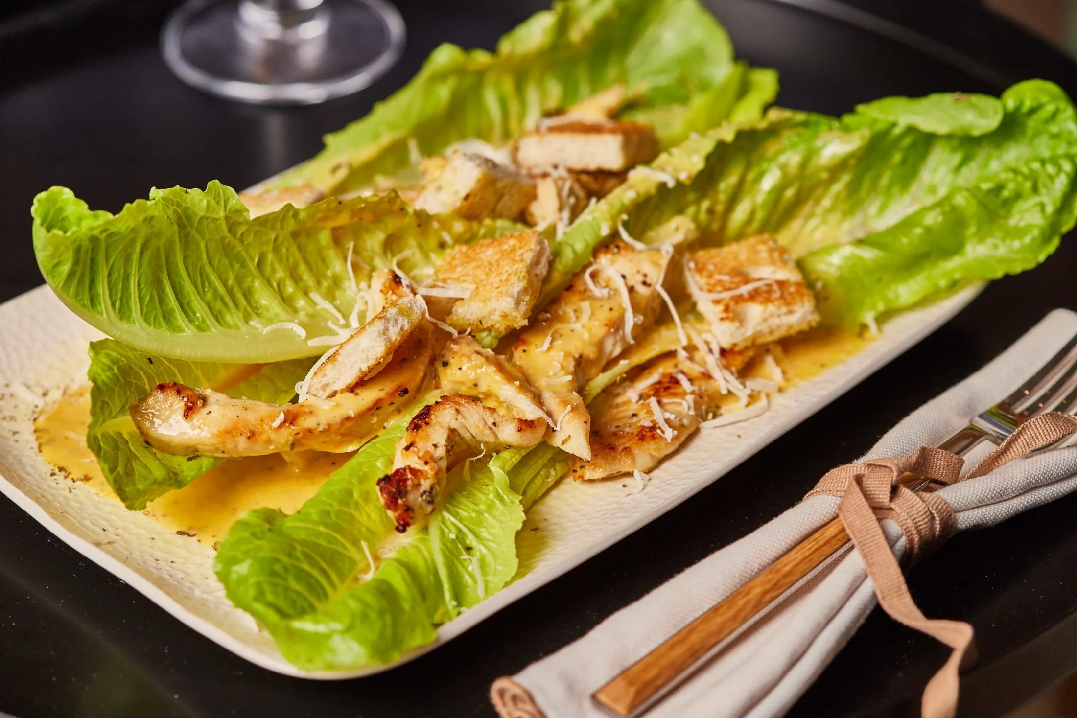 Tálaláskor a salátára locsolunk a dresszingből, rátesszük a kihűlt csirkét, a krutonokat, még esetleg meglocsolhatjuk egy kis olívaolajjal, és reszelünk rá parmezánt.