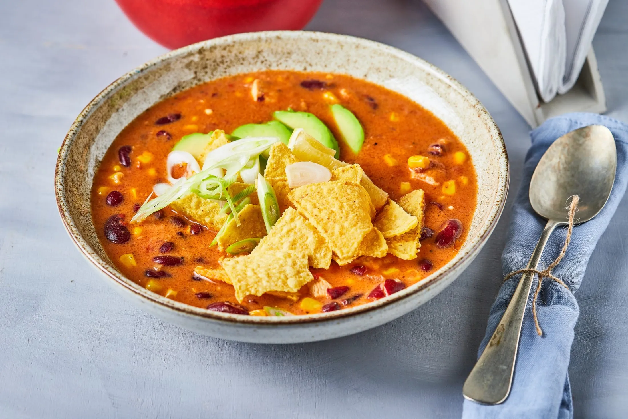 Tányérba szedjük a levest, a tetejére tesszük a szeletekre vágott avokádót, megszórjuk újhagymával, rászórjuk a tortillát, és tehetünk rá egy cikk citromot is.