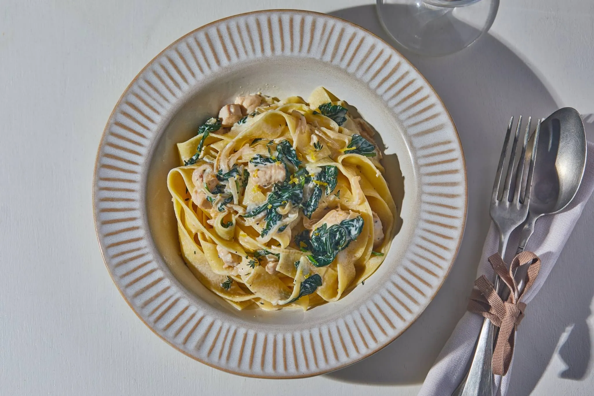 Házi édesburgonya-tészta tejszínes parajjal és sült csirkével