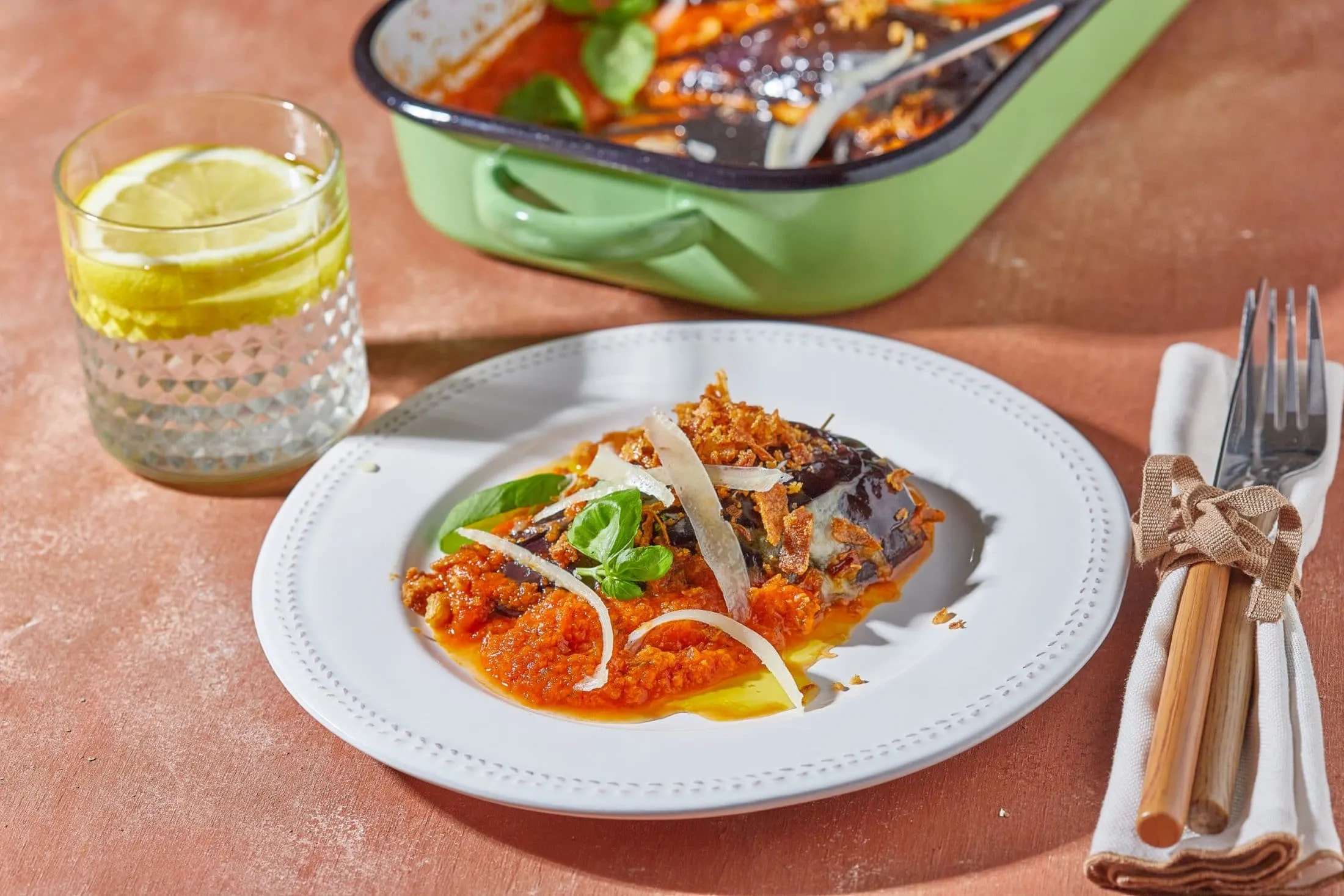 A mozzarellát felszeleteljük, majd rakunk a szeletekből a padlizsán zsebeibe, 1-2 levél bazsalikommal együtt. A mártásunkat egy tepsibe halmozzuk, belehelyezzük a töltött padlizsánokat, majd 180 fokra előmelegített sütőbe tesszük 15 percre. Tálaláskor megszórjuk pár szelet parmezánnal, pirított hagymával és bazsalikommal.
