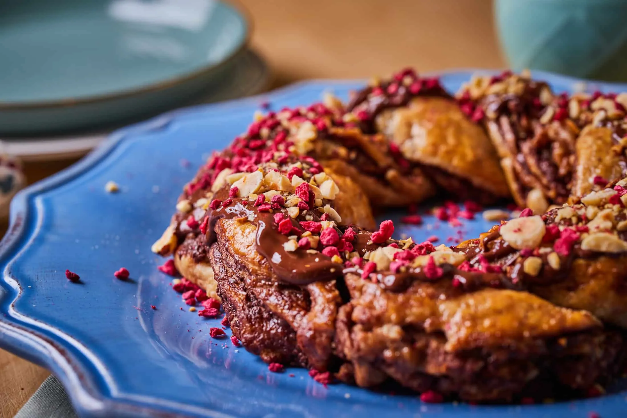 A kész koszorút megcsurgatjuk felolvasztott étcsokival, majd rászórjuk a maradék pirított török mogyorót és a liofilizált málnát. Megvárjuk, amíg teljesen kihűl, ezután szeletelhetjük.