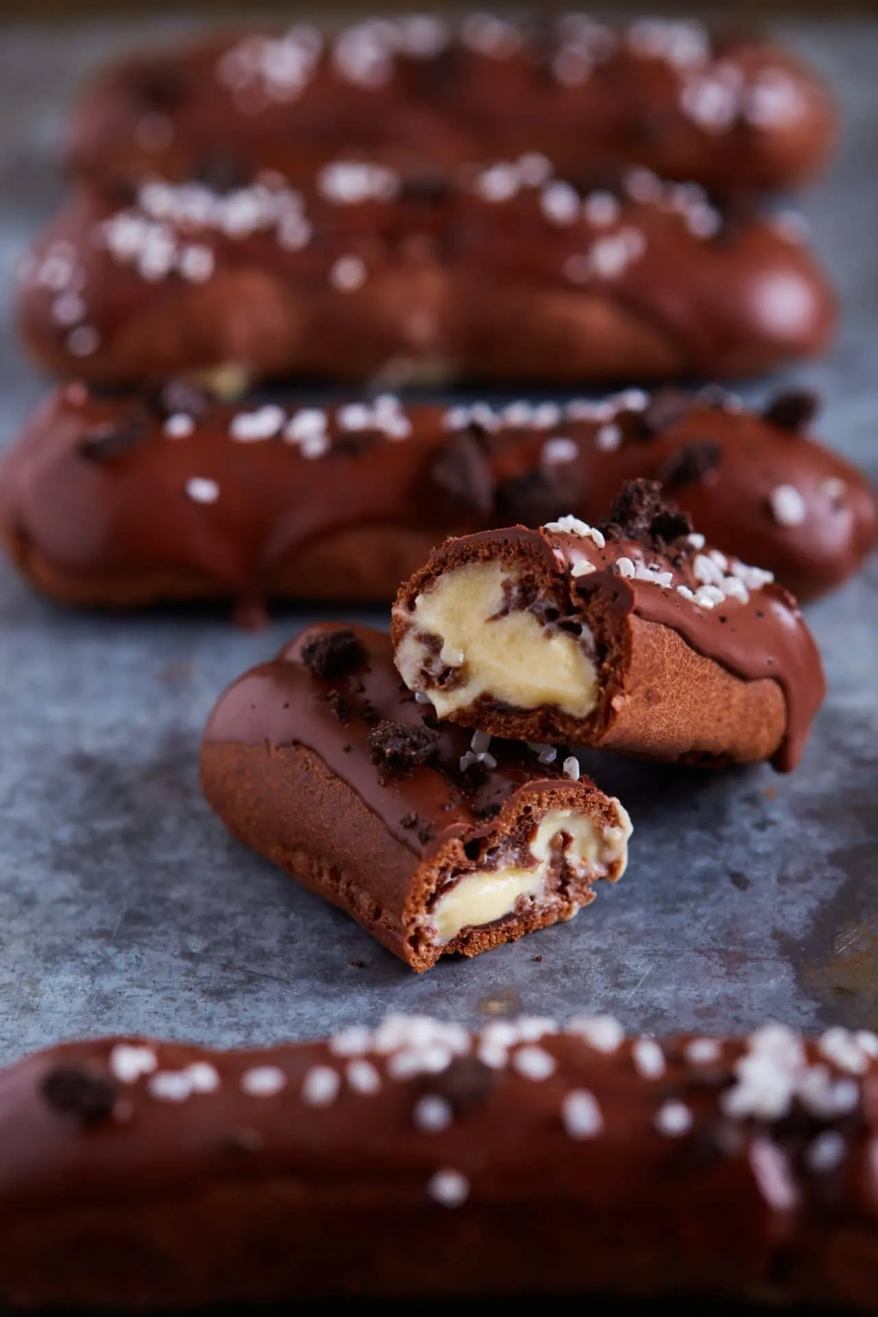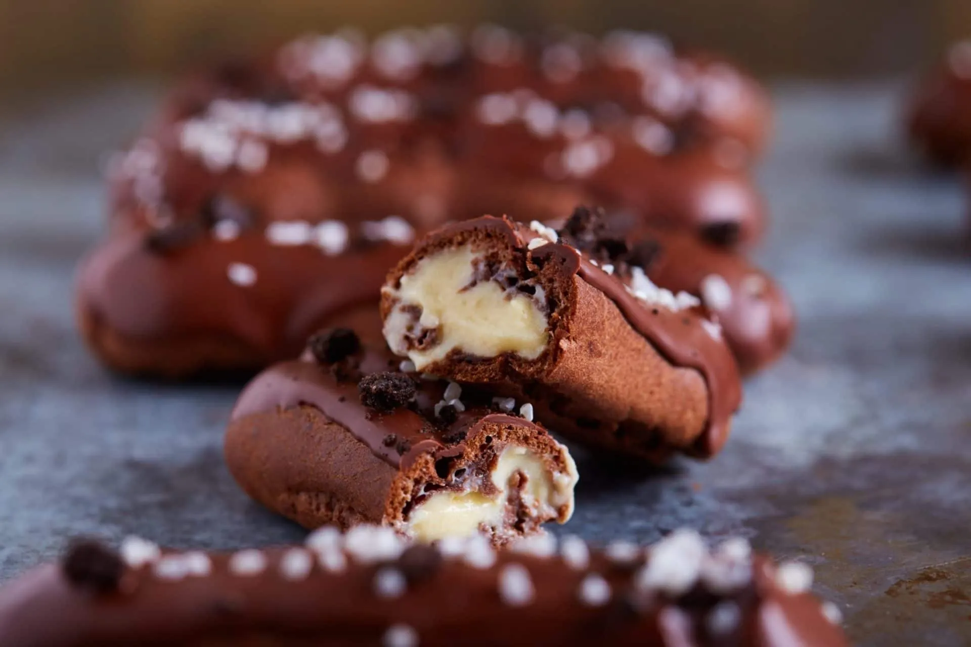 A tésztához a vizet, a vajat, a sót és a cukrot összeforraljuk egy edényben, belekeverjük a lisztet, a kakaóport, és 1-2 percig keverjük, amíg szépen összeáll a tészta, és elválik az edény falától. Lehúzzunk a lángról, majd és egyenként belekeverjük a tojásokat.