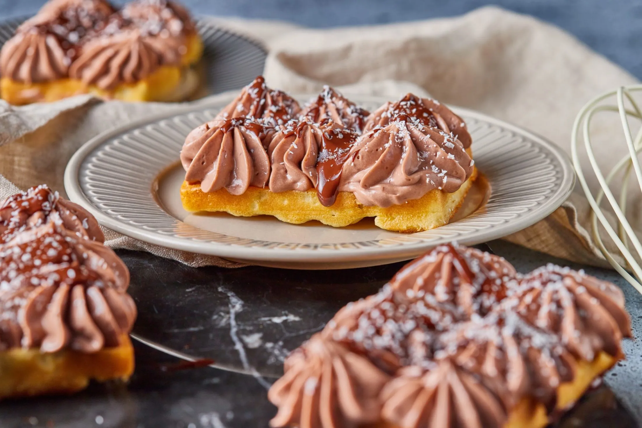 A pudinghoz hozzáadjuk a mascarponét, és egy gépi habverő segítségével kb. 1 perc alatt kihabosítjuk. Ezután habzsákba töltjük a krémet, és a gofrik tetejére nyomjuk.