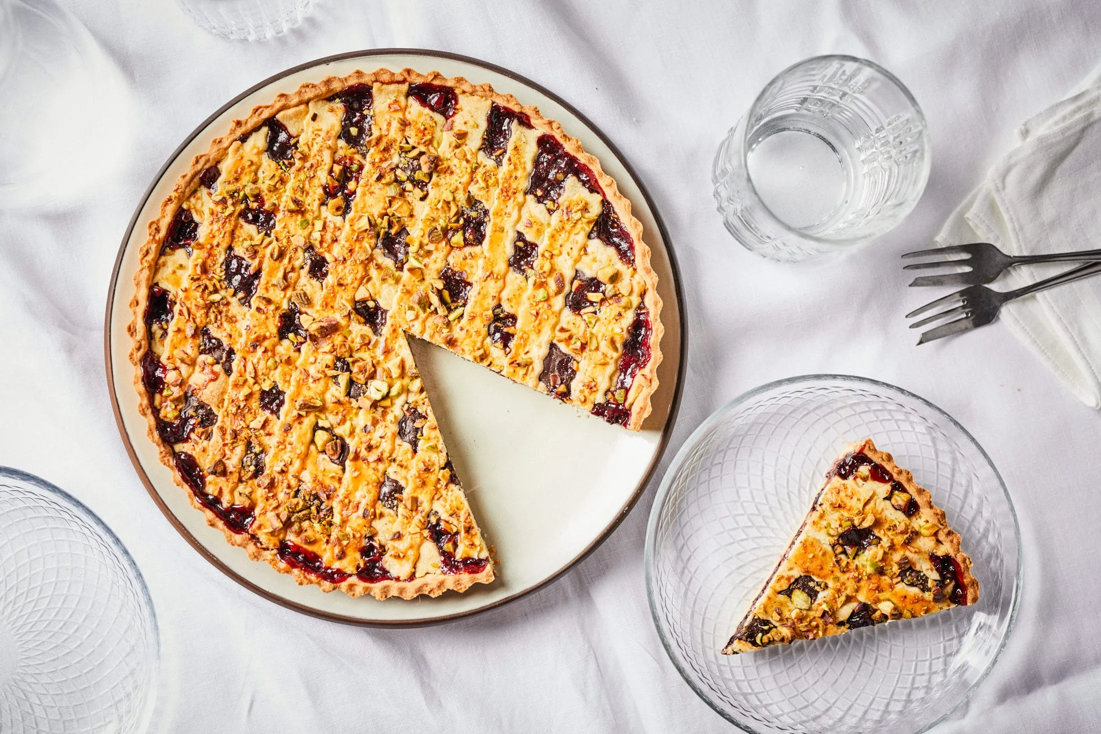 A másik tésztadarabot is kivesszük a hűtőből, ugyanúgy kinyújtjuk, mint az előzőt, és derelyevágóval felcsíkozzuk, majd átlósan a pite tetejére rakosgatjuk. Lazán felvert tojással lekenjük a pite tetejét, megszórjuk apróra vágott pisztáciával, és 180 fokra előmelegített sütőbe toljuk 25-30 percre, mialatt aranybarnára sül.