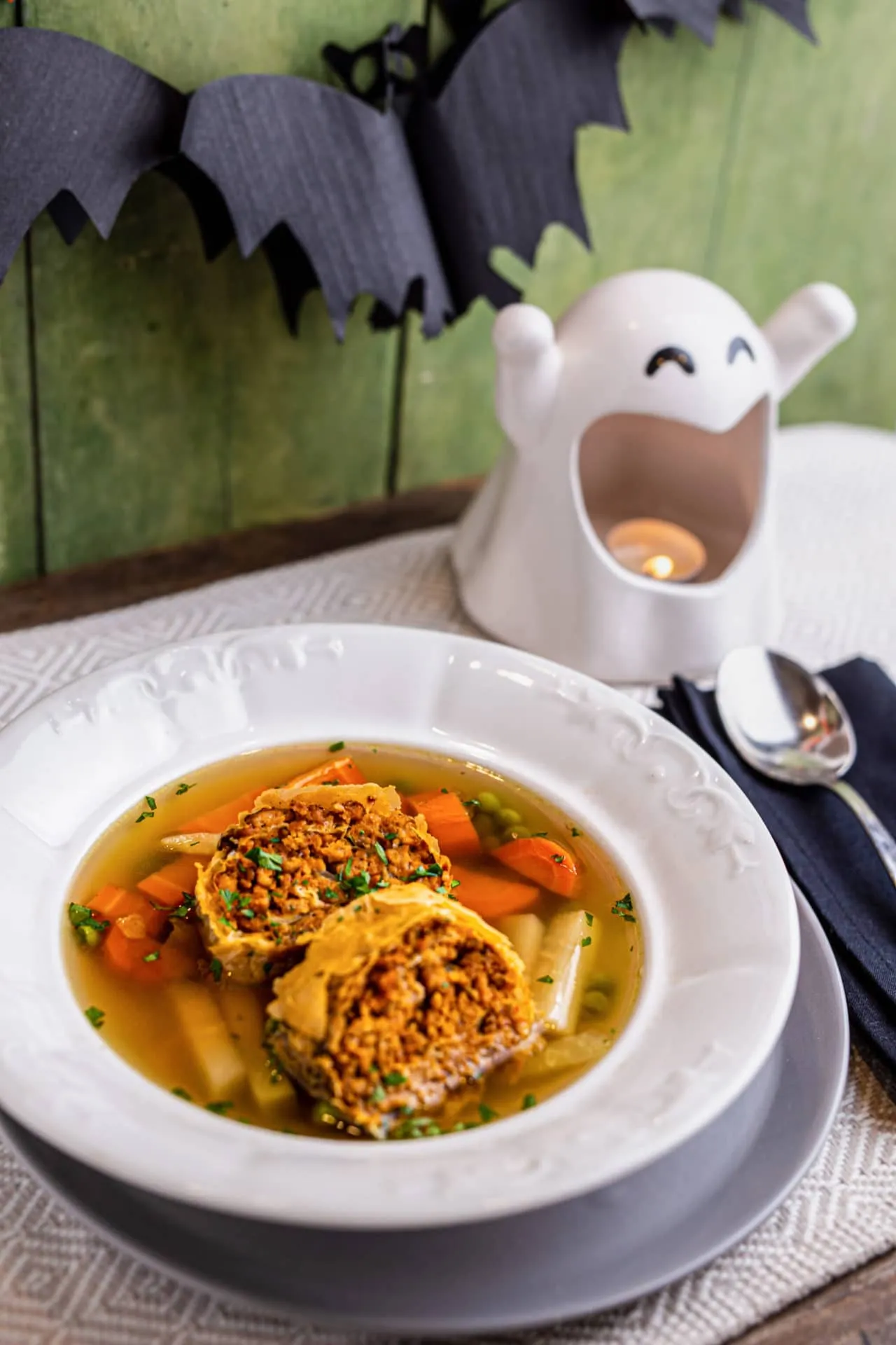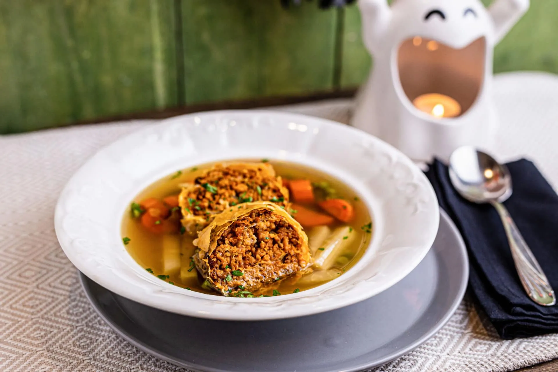 Ha elkészült a rétes, felszeleteljük, a tálakba szedünk egy kis levest a zöldségekkel, rárakjuk a rétest, megszórjuk egy kevés friss petrezselyemmel, és tálaljuk.